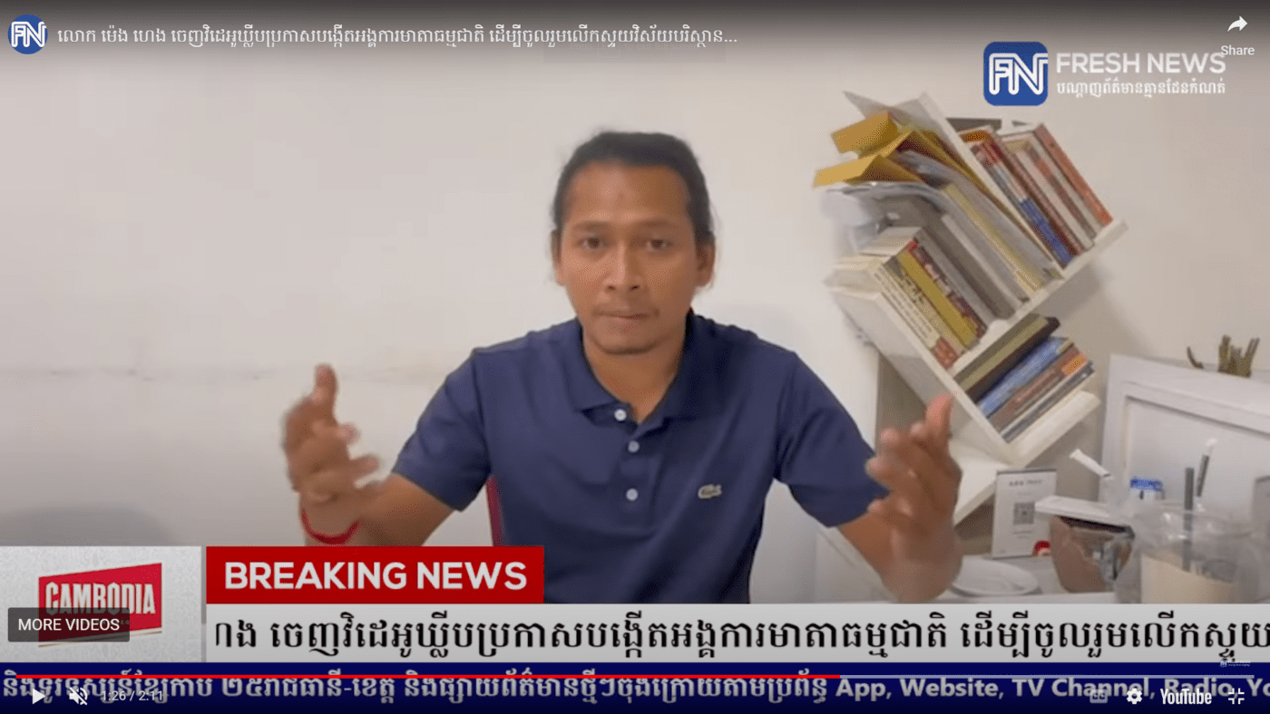 “The reason I participated [with Mother Nature] in the past was because I did not fully carry out social activities according to my abilities and did not deeply understand the Royal Government’s environmental protection policy, which is why I did social activities contrary to the law,” Heng said in a video clip published by government-aligned media Fresh News.
