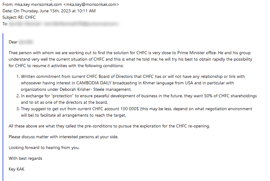 Three conditions were relayed by a certified public accountant named Kak Key, managing partner for the Phnom Penh-based firm Morison Kak & Associés, in an email sent on June 15 to a Center of Hope board member but shared with CamboJA by Krisher-Steele.