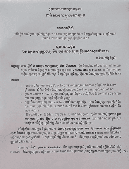 In another potential resolution for the clinics, Center of Hope employees on June 7 submitted a request, viewed by CamboJA, to the Minister of Health requesting that a founding partner of the clinics called the Handa Foundation manage the three facilities and reinstate the staff.