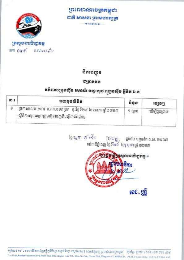 Even before the 30 day deadline, the Ministry of Commerce issued a letter on May 26, seen by CamboJA, to deregister the company.