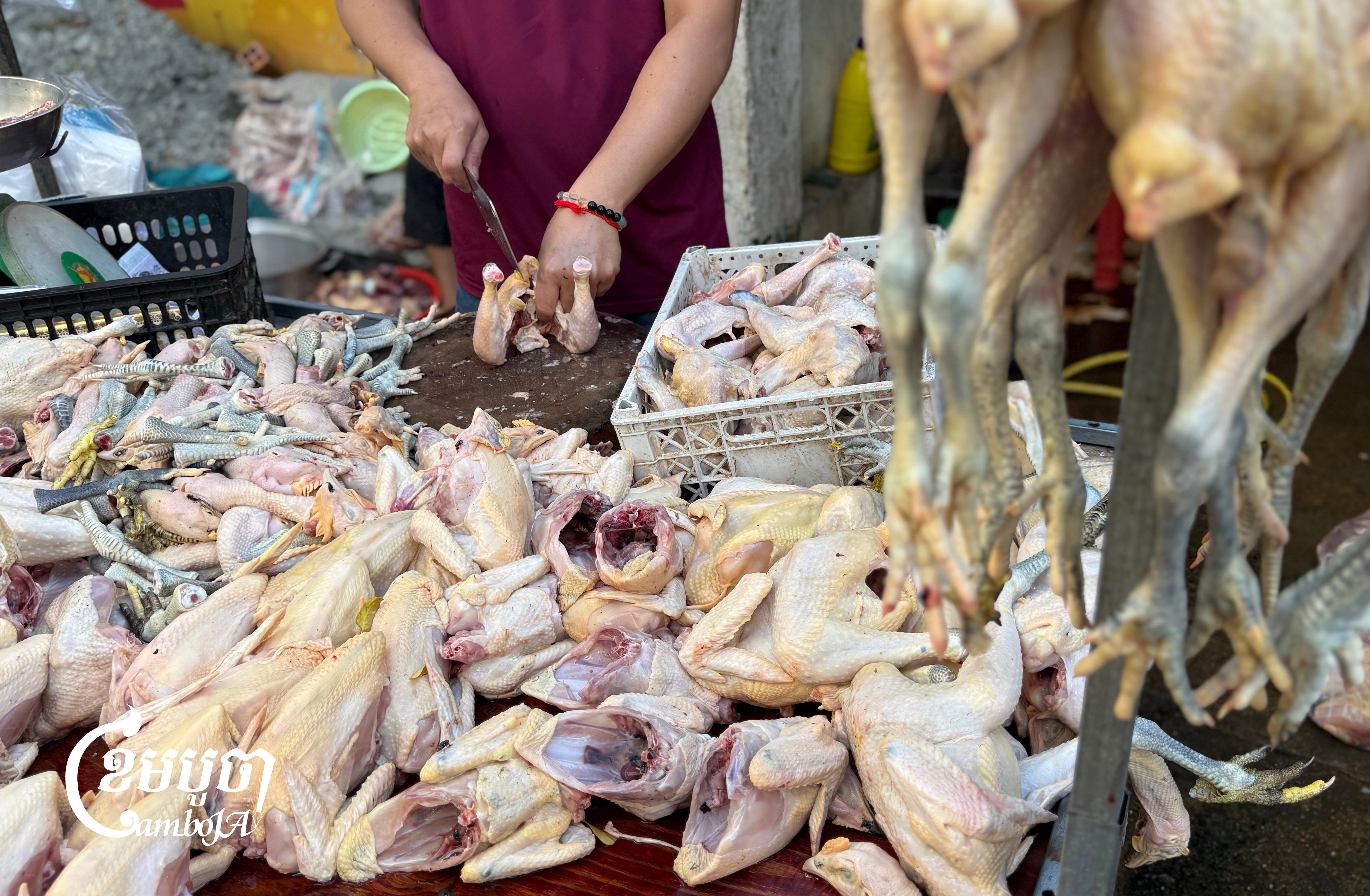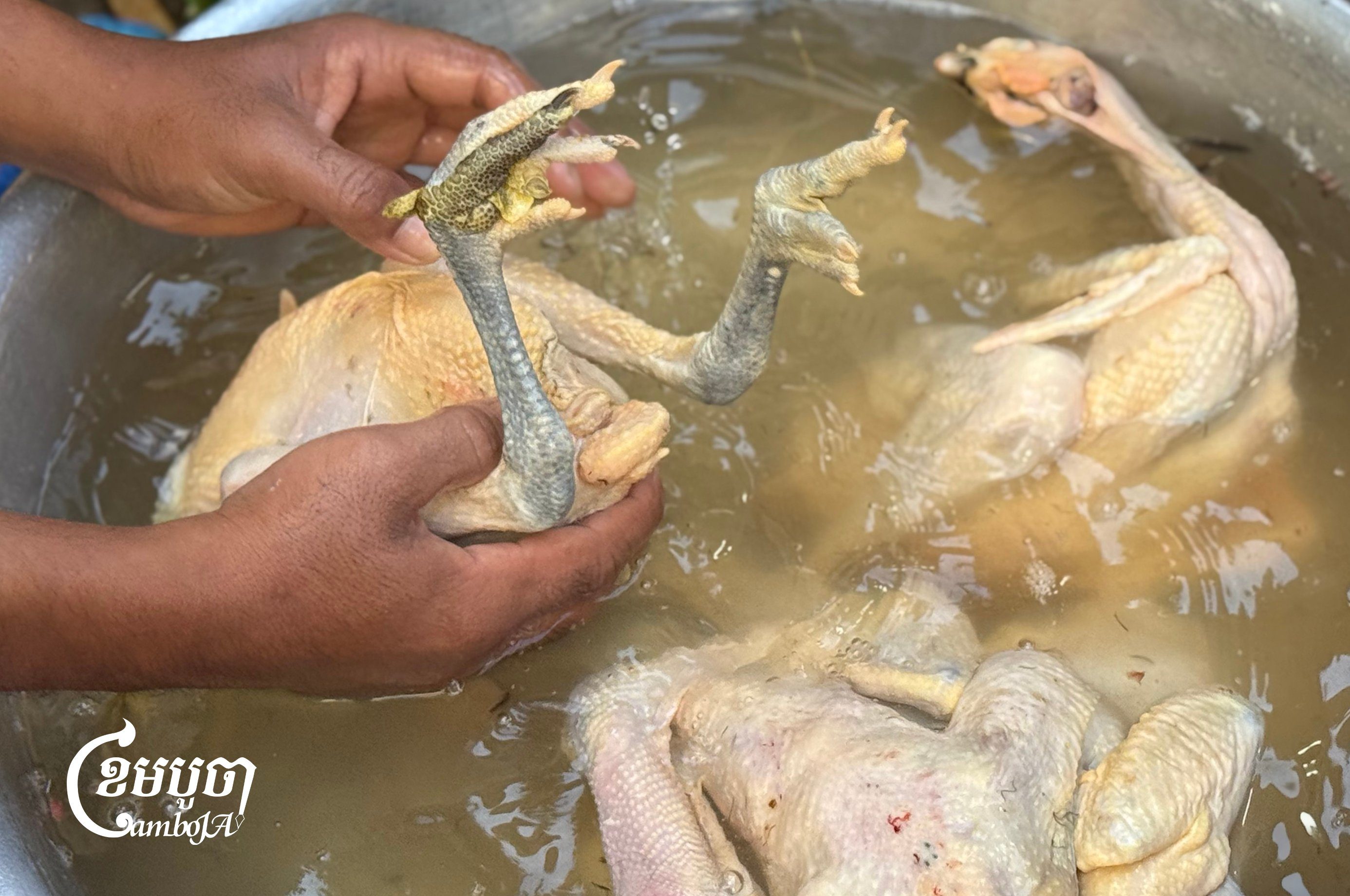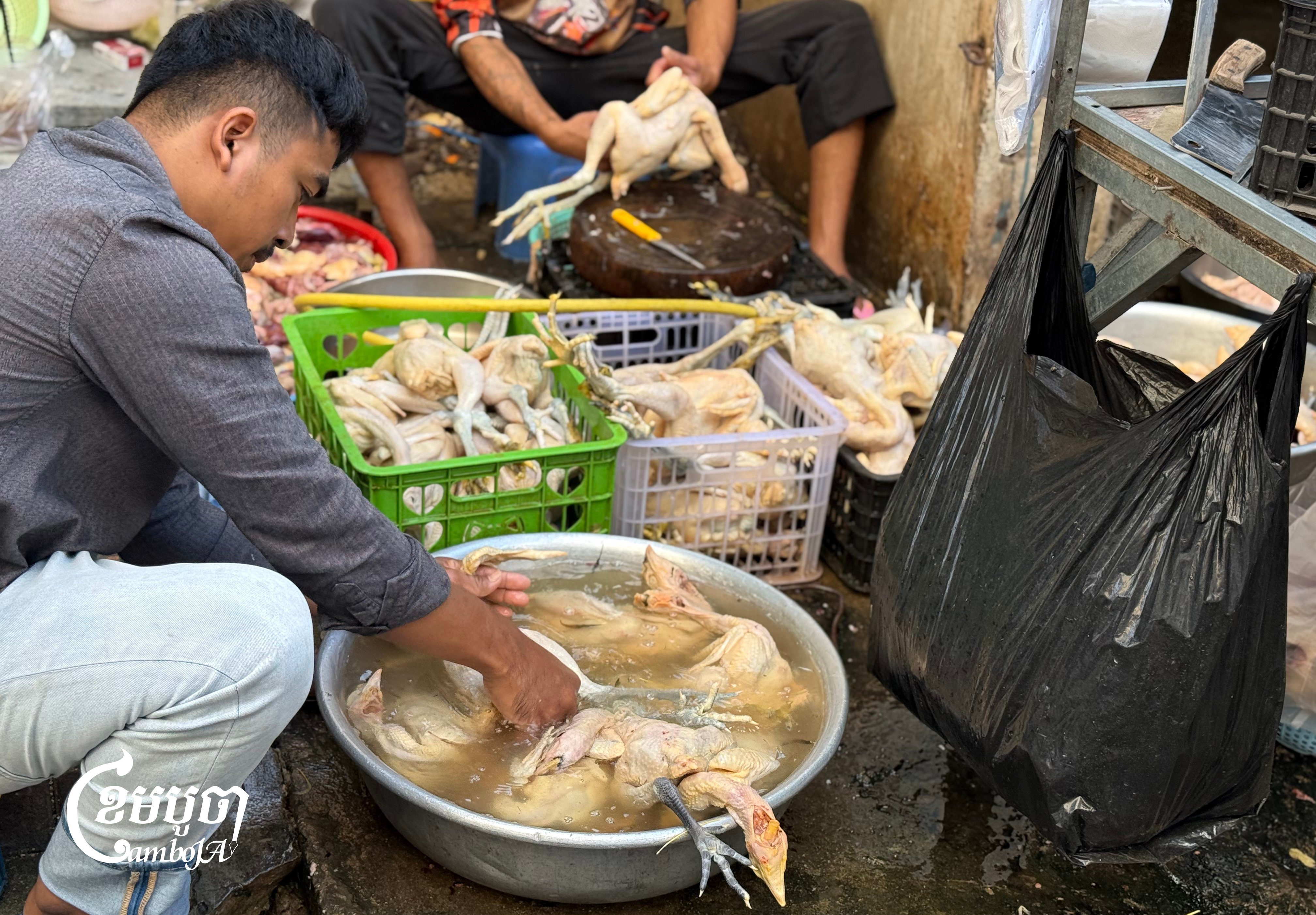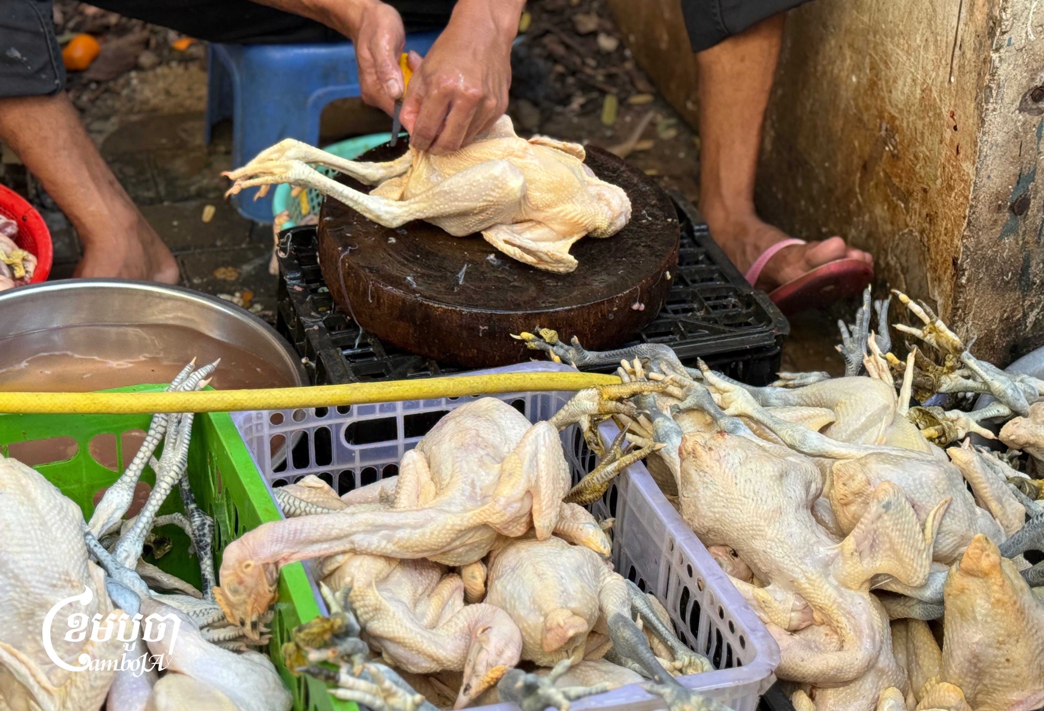 A vendor cleans chickens for sale to customers at a market in Phnom Penh on November 18, 2025, after Cambodian Ministry of Health issued a press release on November 15 about the death of a 22-year-old man from the H5N1 bird flu. (CamboJA/ Pring Samrang)