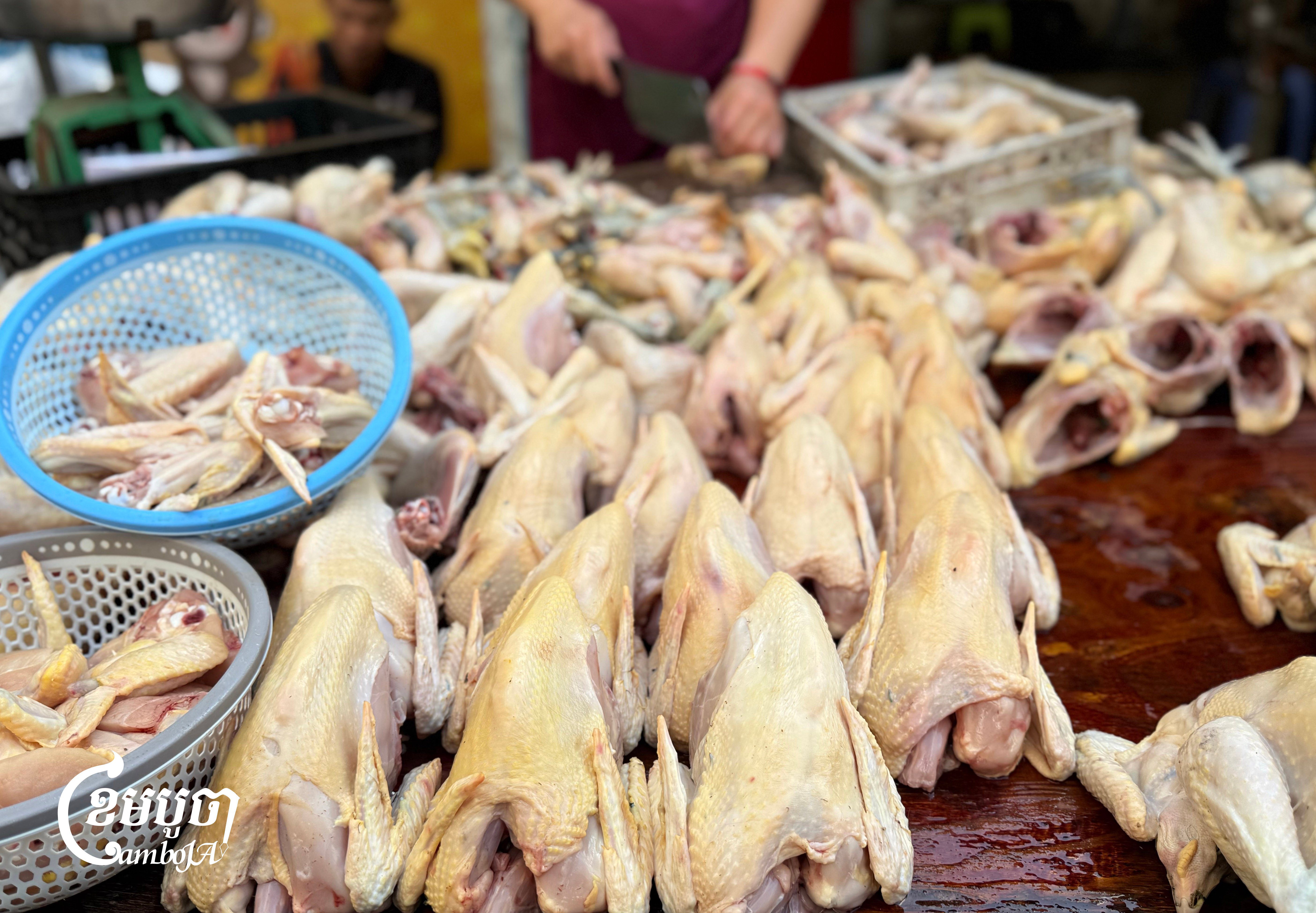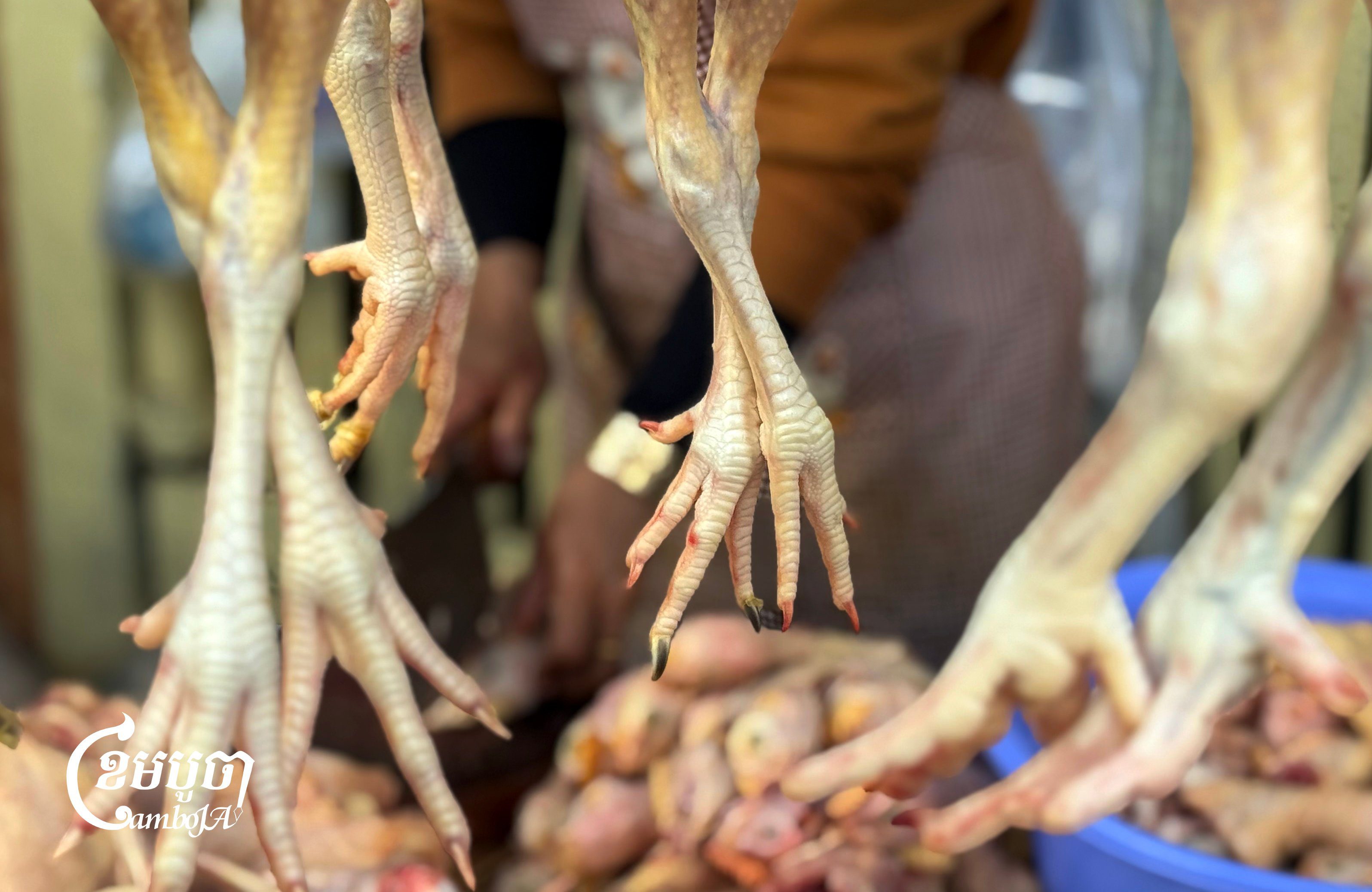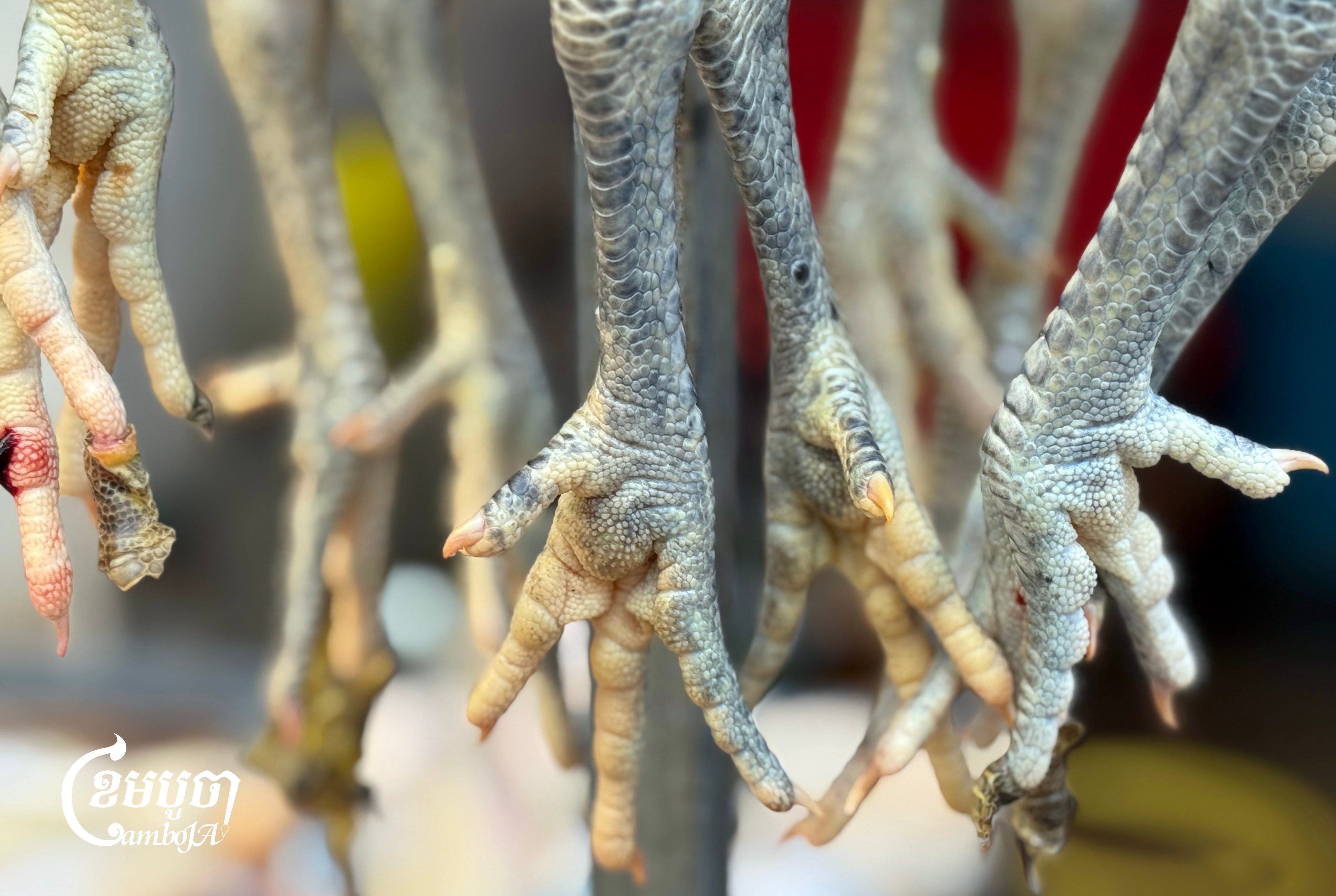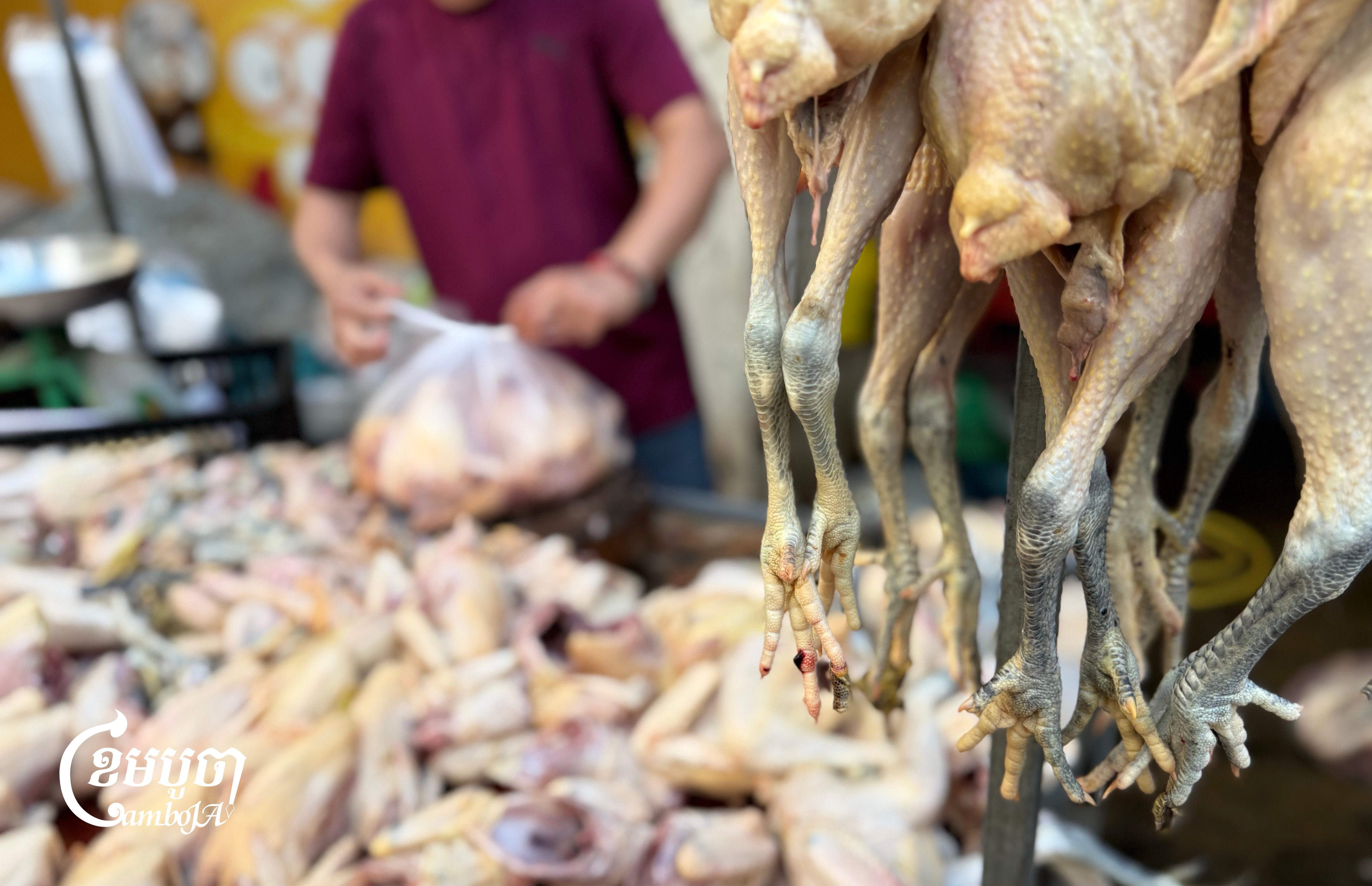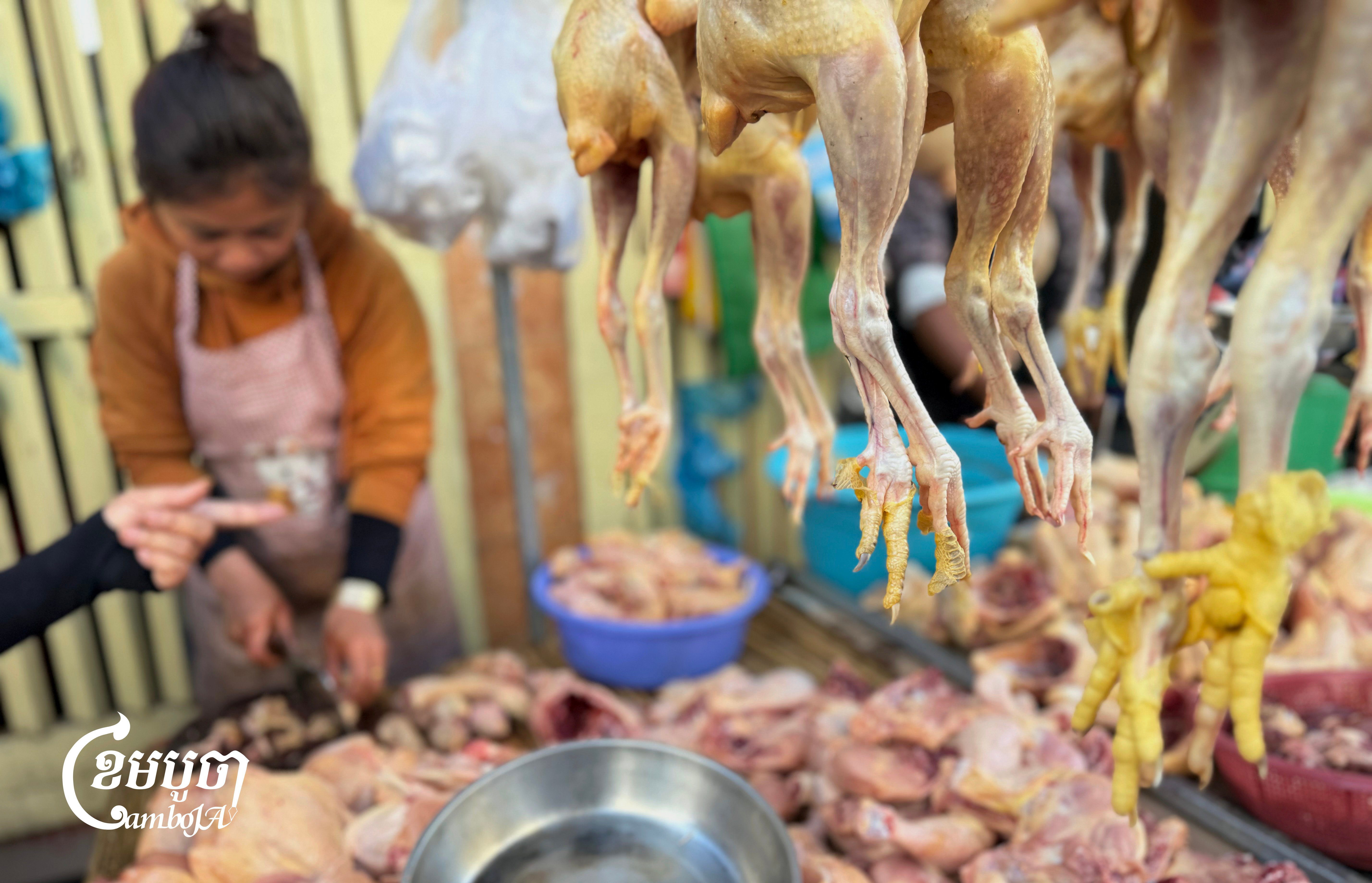 A vendor cleans chickens for sale to customers at a market in Phnom Penh on November 18, 2025, after Cambodian Ministry of Health issued a press release on November 15 about the death of a 22-year-old man from the H5N1 bird flu. (CamboJA/ Pring Samrang)