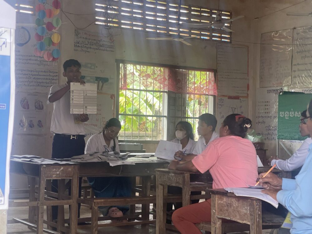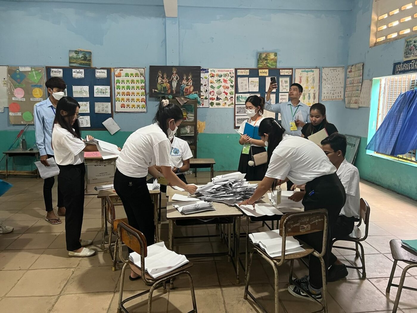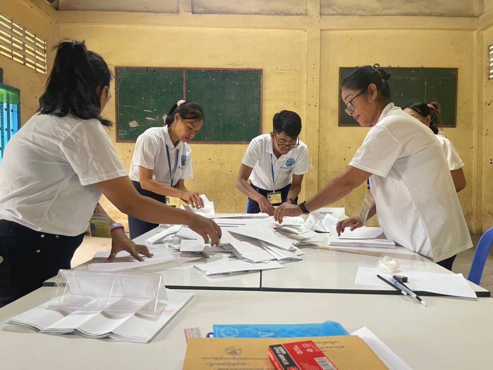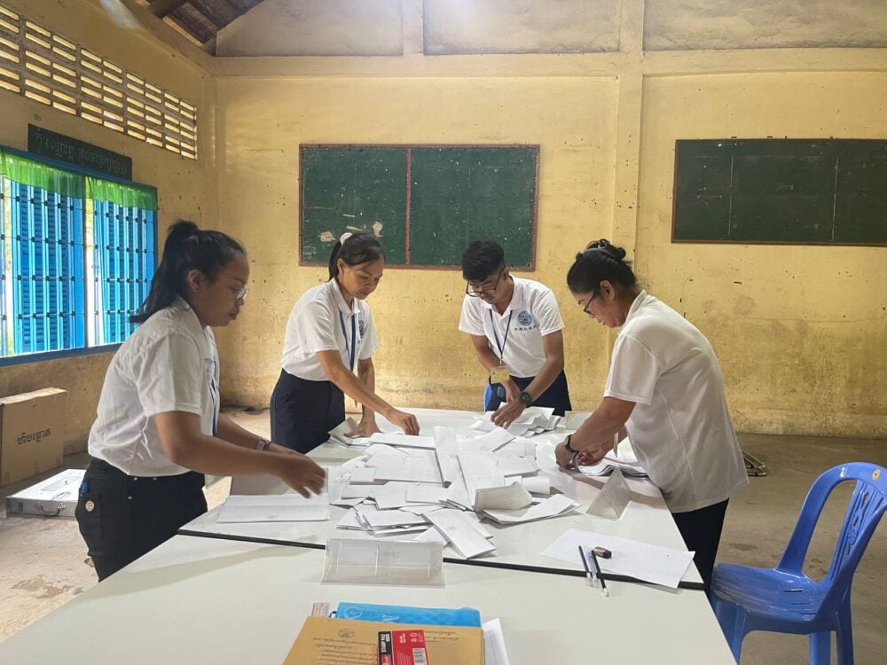 3:30 pm: Poll workers organize ballots at Tuol Svay Prey 1 commune, which Human Rights Watch identified as a site where officials had improperly recorded votes in the 2022 commune elections (the head of the commune’s election committee denied this to CamboJA). At the start of the process, a CamboJA reporter was told by a worker that only one election observer from a political party was present in one room, and she was with the ruling CPP. A CPP observer appeared to be the only observer in another room as well.