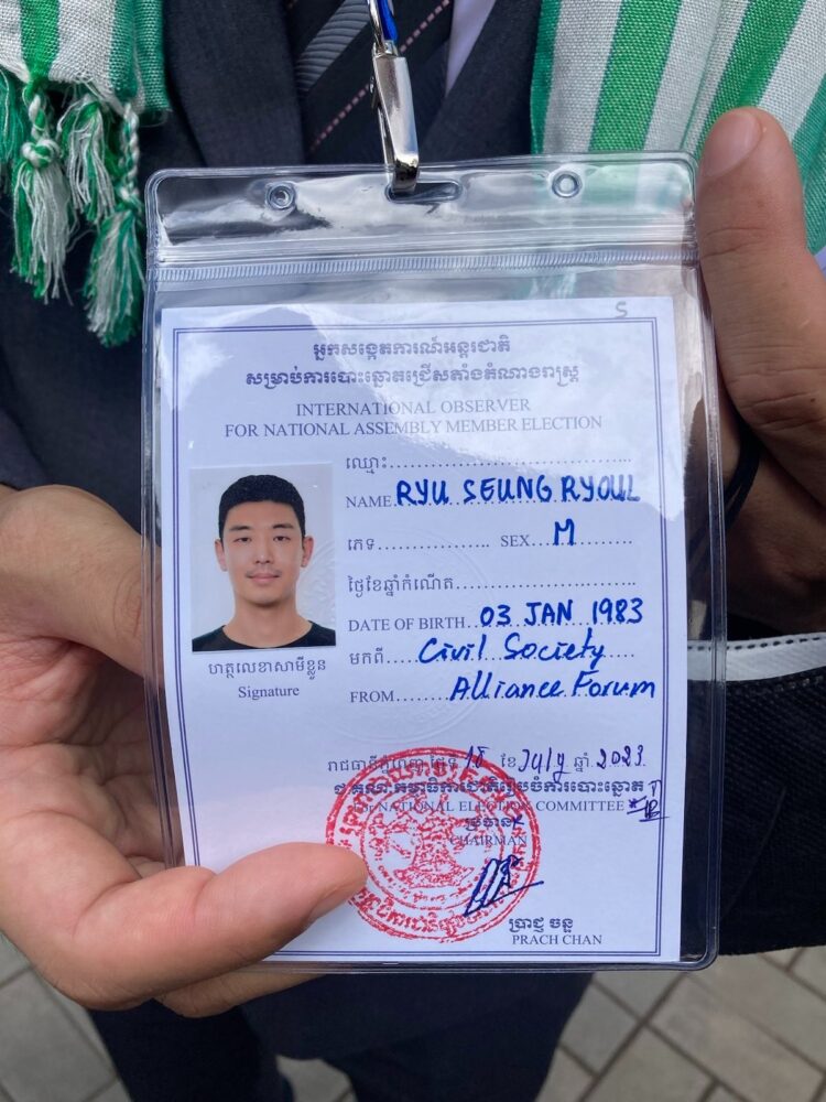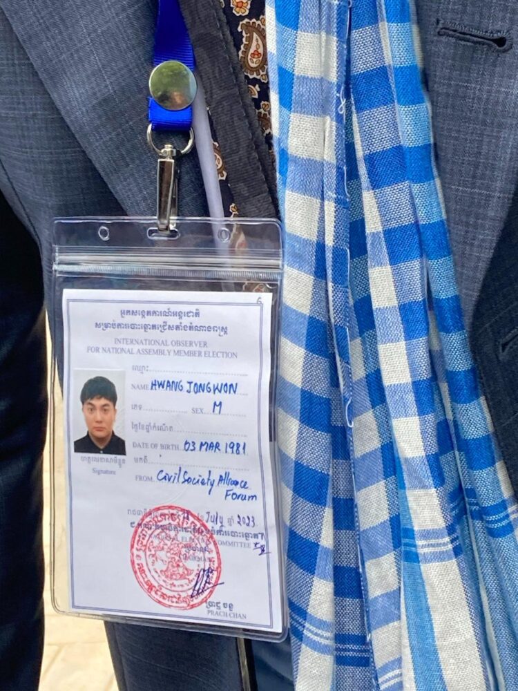 8:50am: Two Korean nationals, Ryu Seung Ryoul and Hwang Jong Kion, were at the polling site at Tuol Kork Primary School wearing international observer badges issued by the NEC. But the organization they are with is Civil Society Alliance Forum, a Cambodian government-affiliated institution. They said they have no Korean organization affiliation and were invited by the Cambodian government.