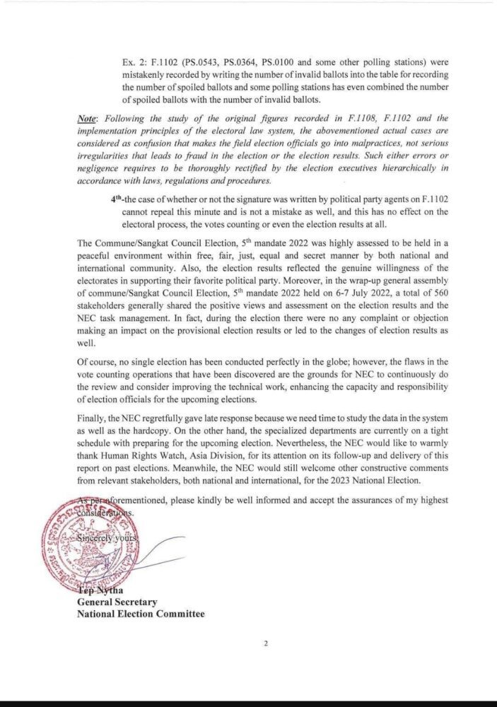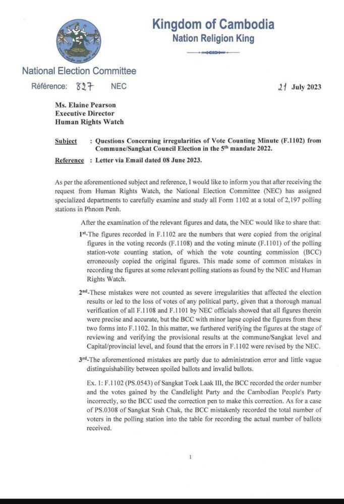 When asked about HRW’s findings, Sovannarom referred to his government agency’s official response. Two days before election day, the NEC conceded there were “mistakes” and “flaws in the vote counting operations.” However, the NEC said the mistakes were not “severe irregularities” and did not affect election results.