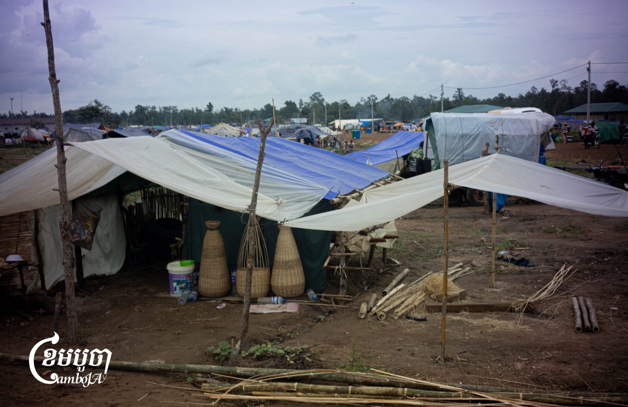 The tents have a plastic roof, crisscrossed with ropes, and sport a rubber mat and pillow inside, with a protective mosquito net around it. This is Wat Pur 5000, a camp for war-displaced people, located in Kulen Tboung village and commune, in Kulen district, Preah Vihear province.