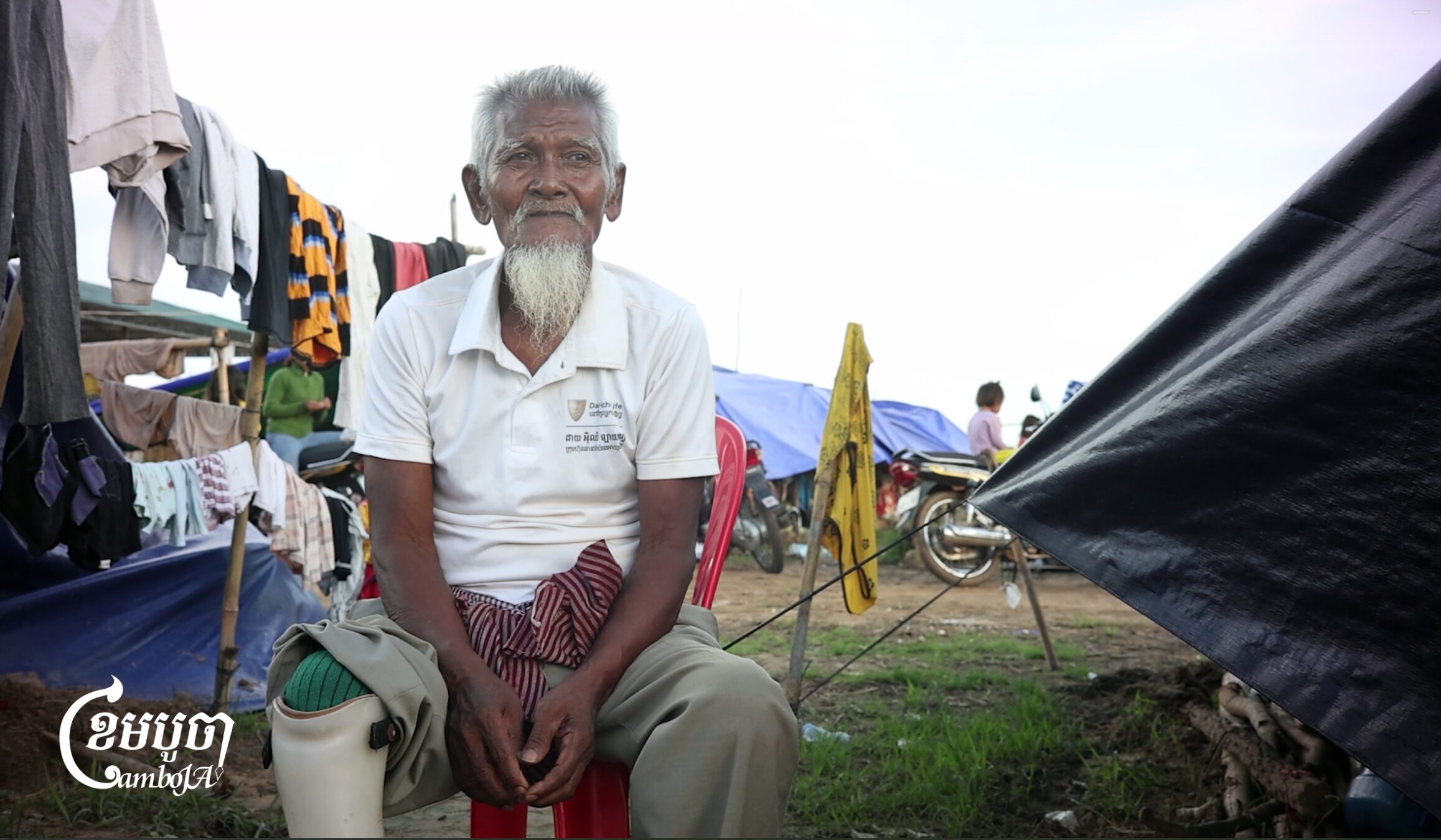About 45 kilometers from the Preah Vihear provincial town, on a stretch of red soil, lies many tents. Inside, elderly people, widows, and people with disabilities are seen sitting, while children play along the dirt road beneath a large sign that reads: “Cambodia Needs Peace”.