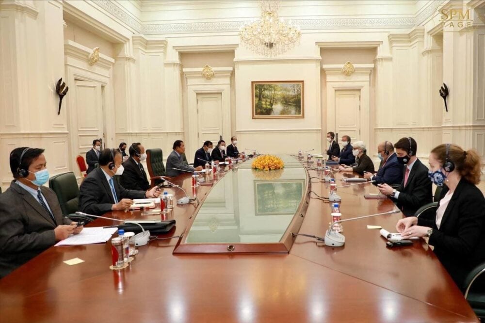 However, in a press briefing after the meeting, Hun Sen’s personal assistant Eang Sophalleth focused instead on the prime minister’s request for the United States to consider converting Cambodia’s outstanding debts dating back to the Lon Nol regime in the 1970s into development assistance. He did not mention Sherman’s comments on Cambodia’s political situation, or the alleged Chinese military presence at Ream.