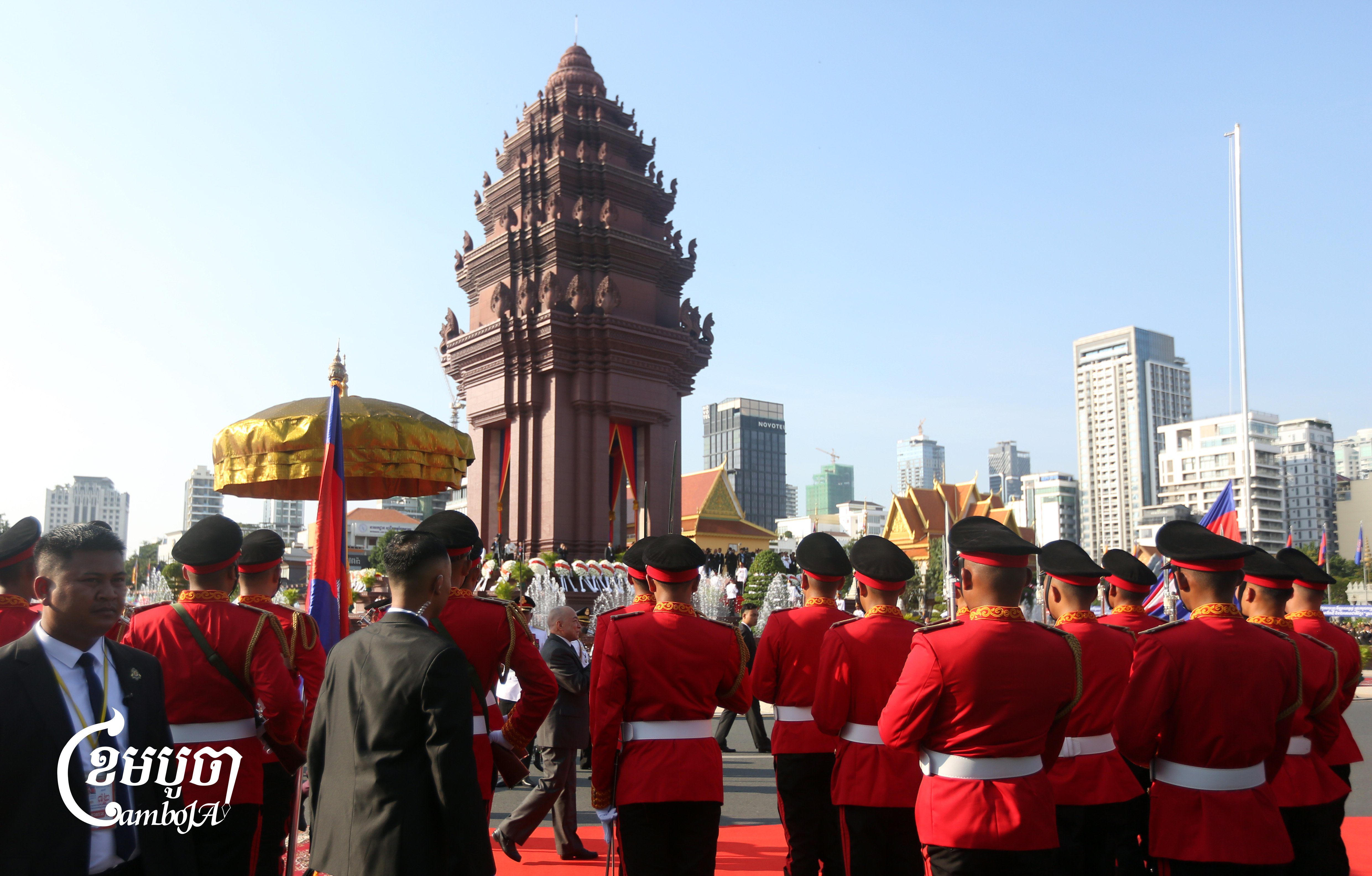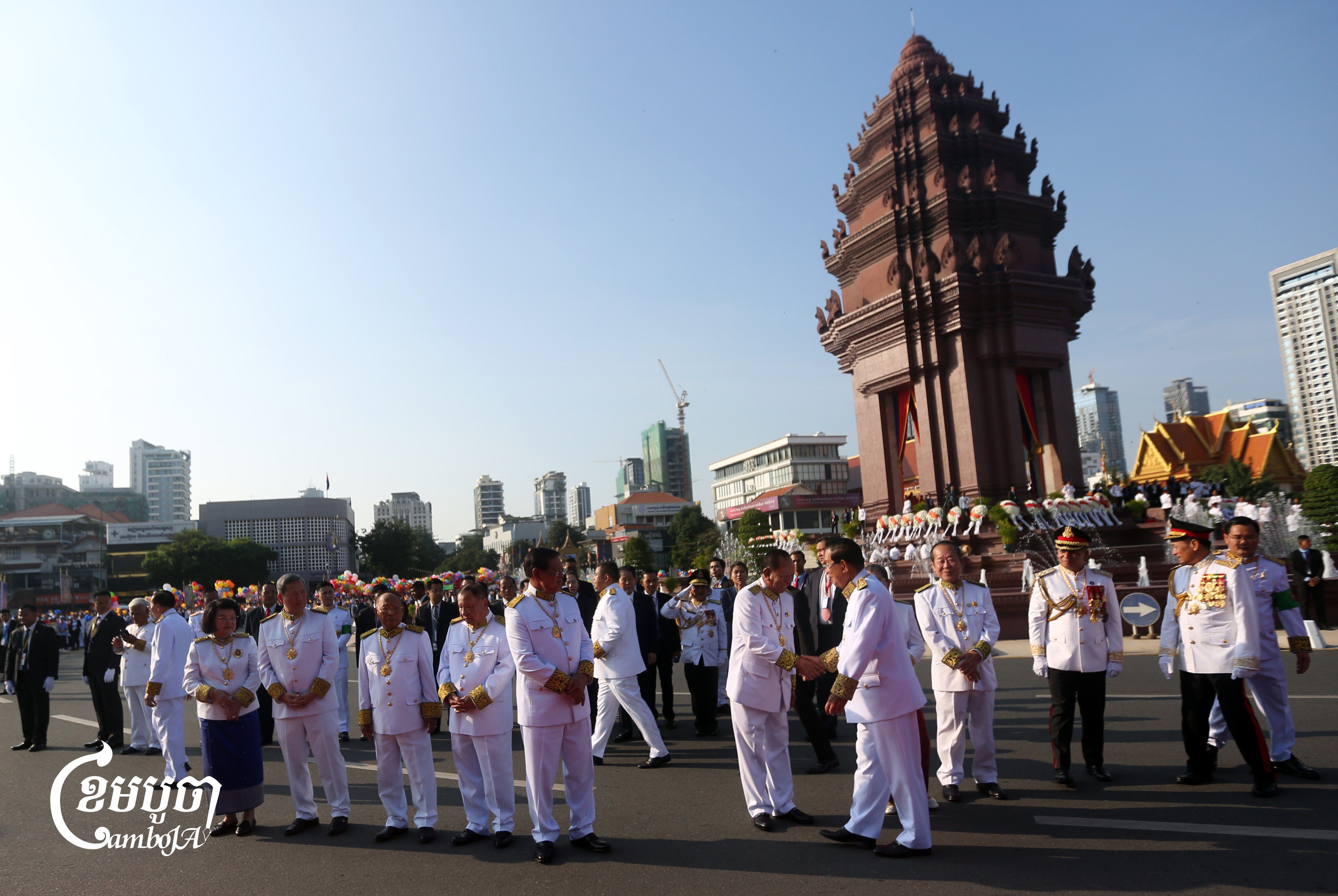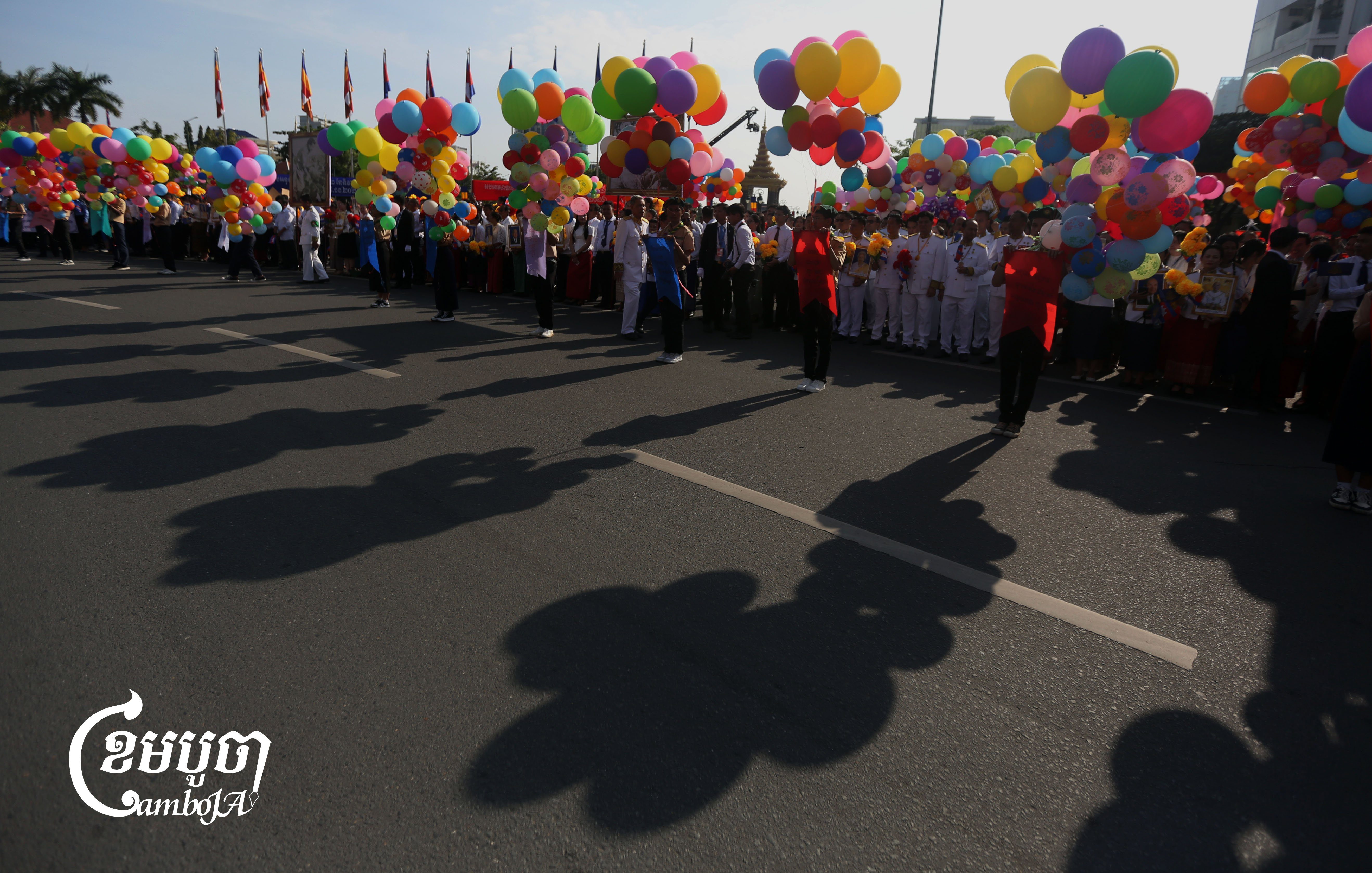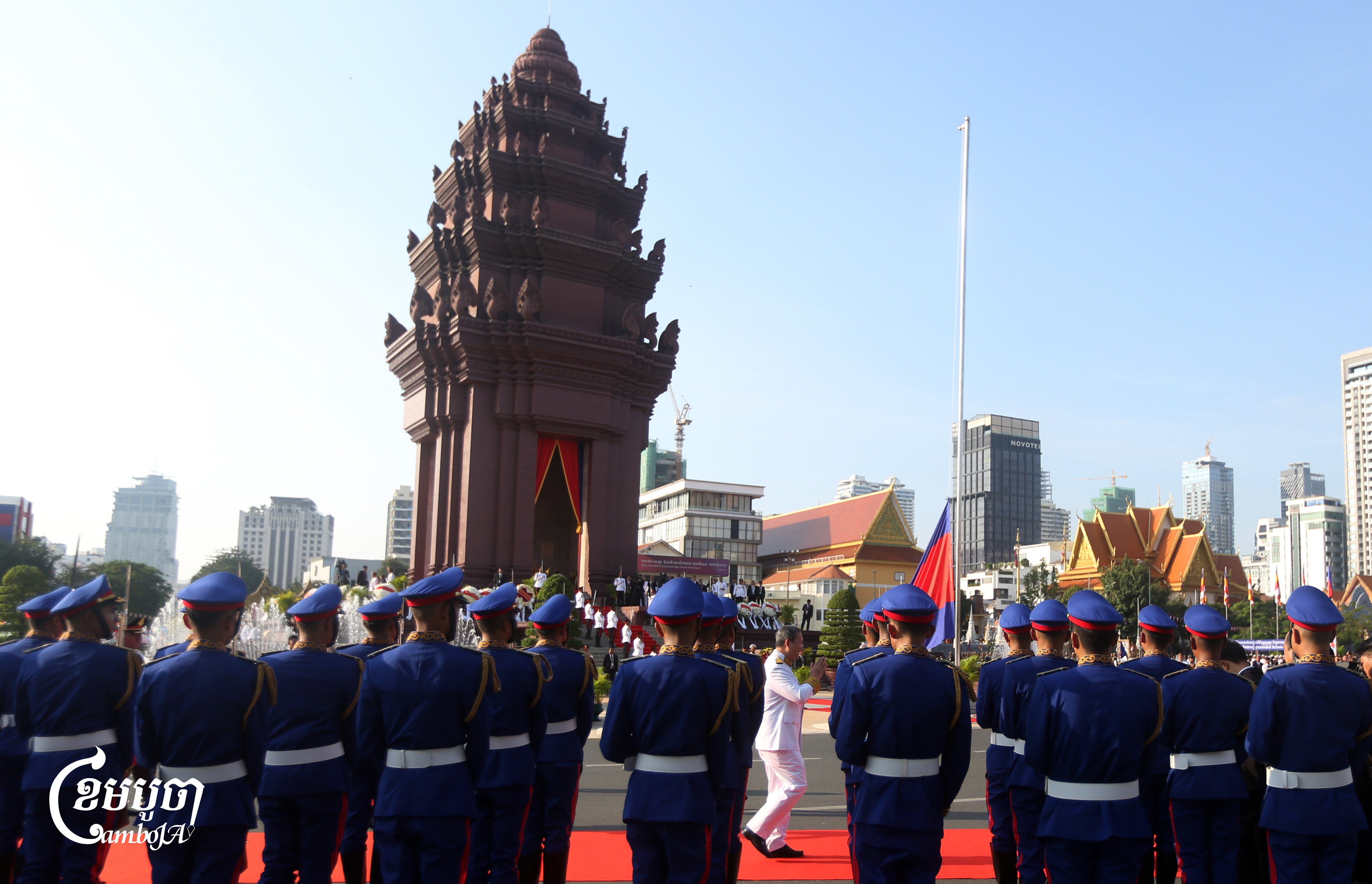 Officials and students participate in Independence Day celebrations in Phnom Penh on November 9. This year, Cambodia celebrates the 72nd anniversary of gaining independence from France in 1953. The historic day, which honors the freedom attained from French colonial rule, was marked with King Norodom Sihamoni lighting a fire at the Independence Monument where hundreds sang the national anthem and witnessed the release of colorful balloons. (CamboJA/ Pring Samrang)