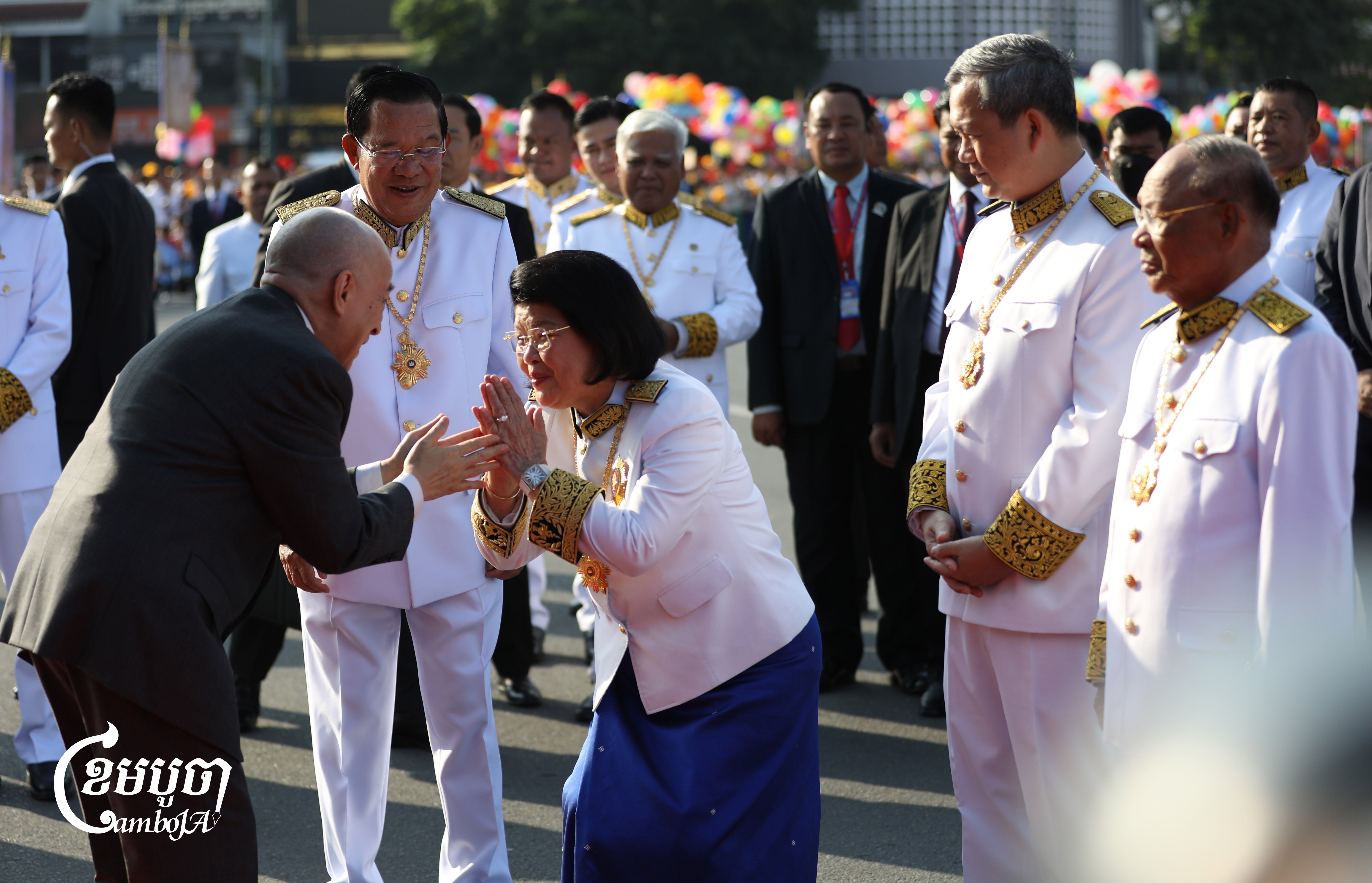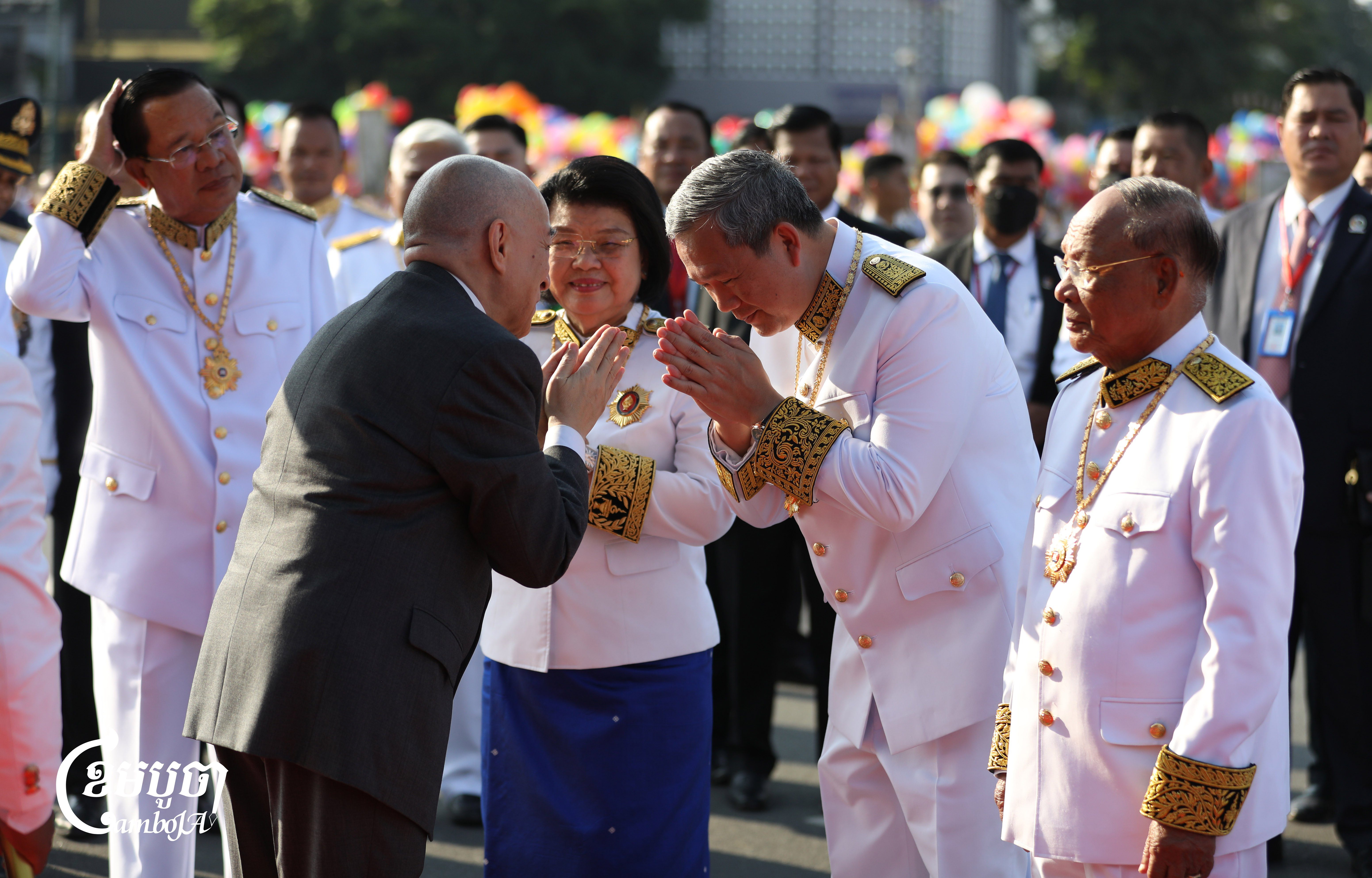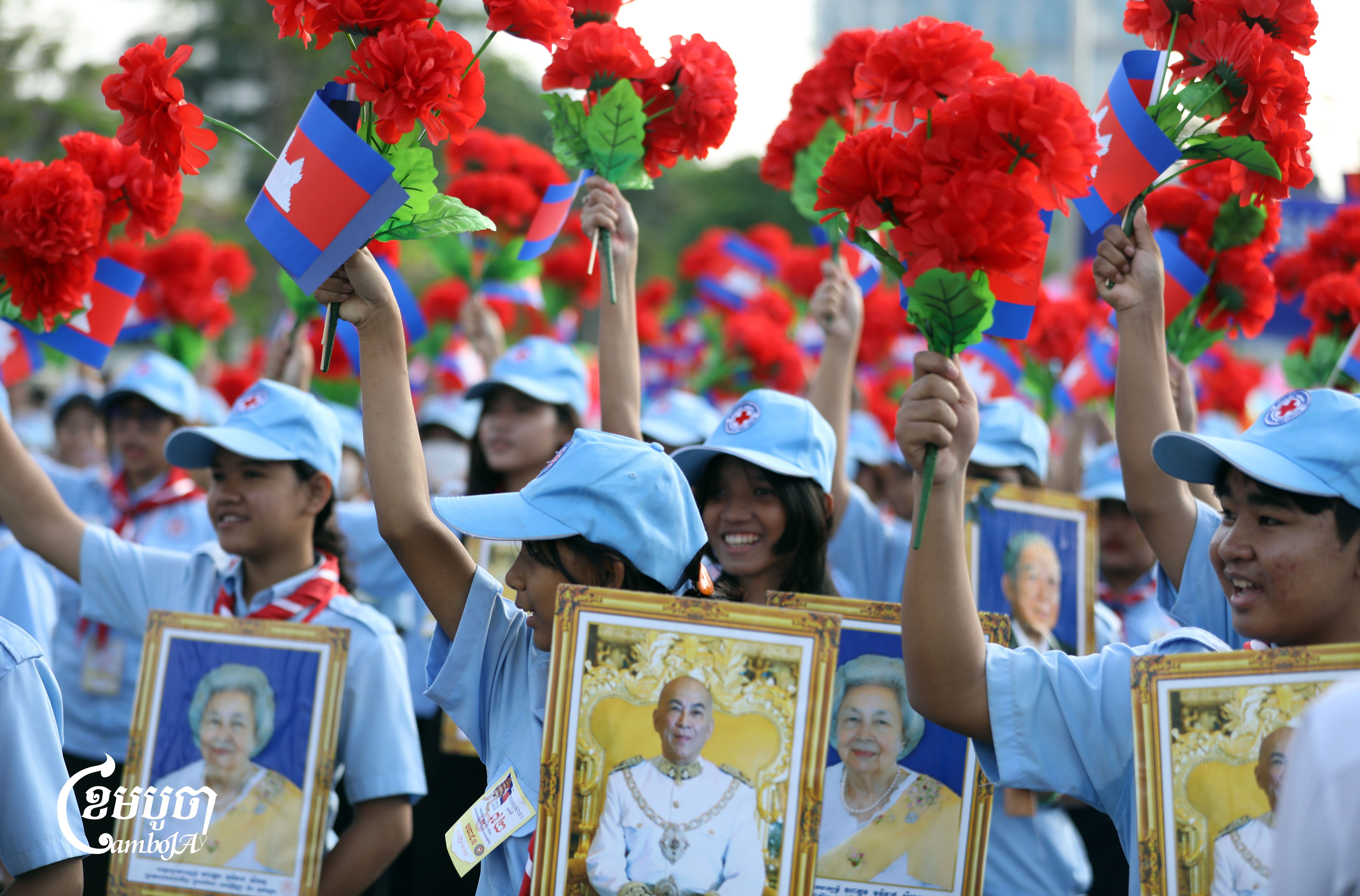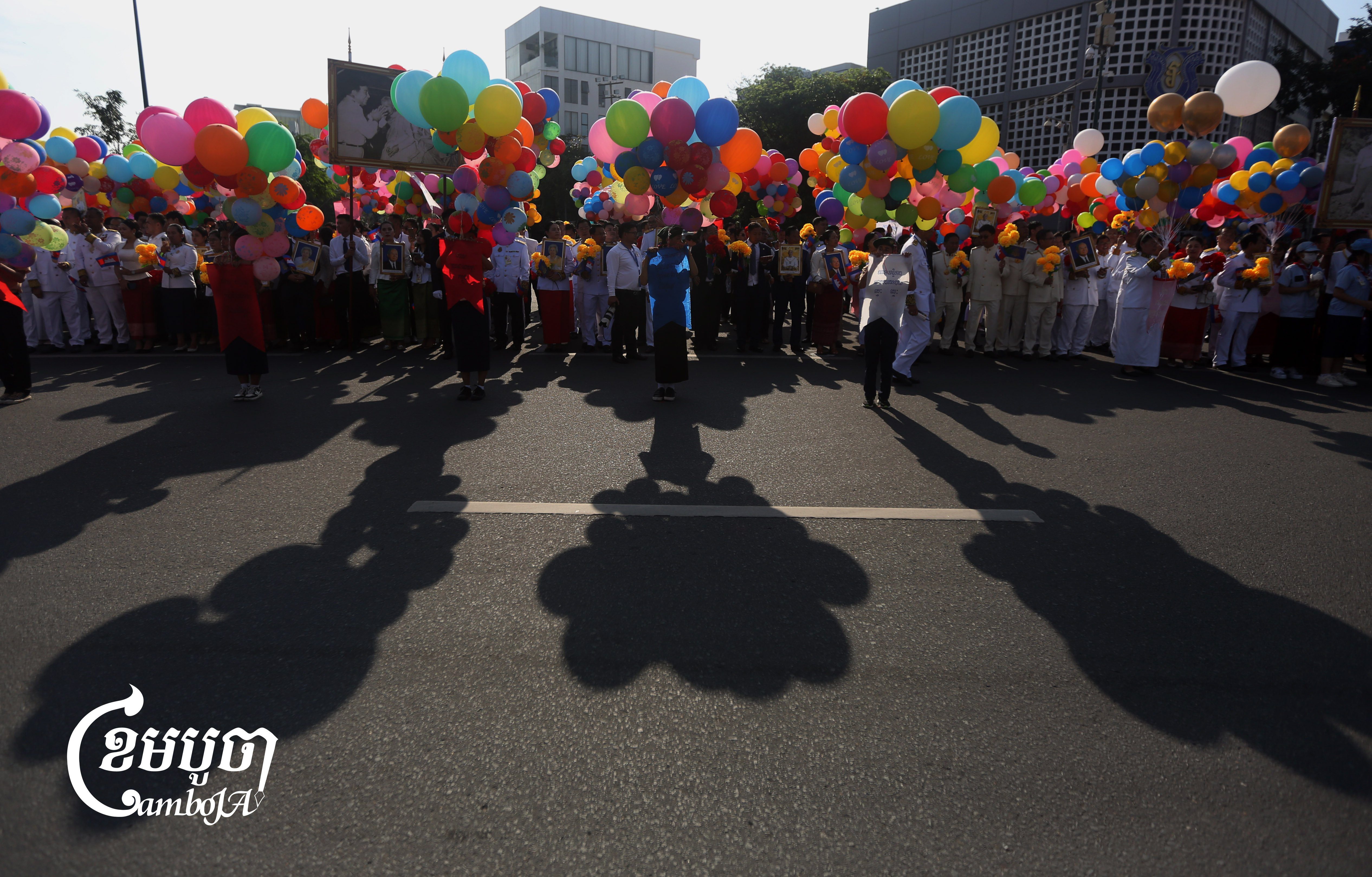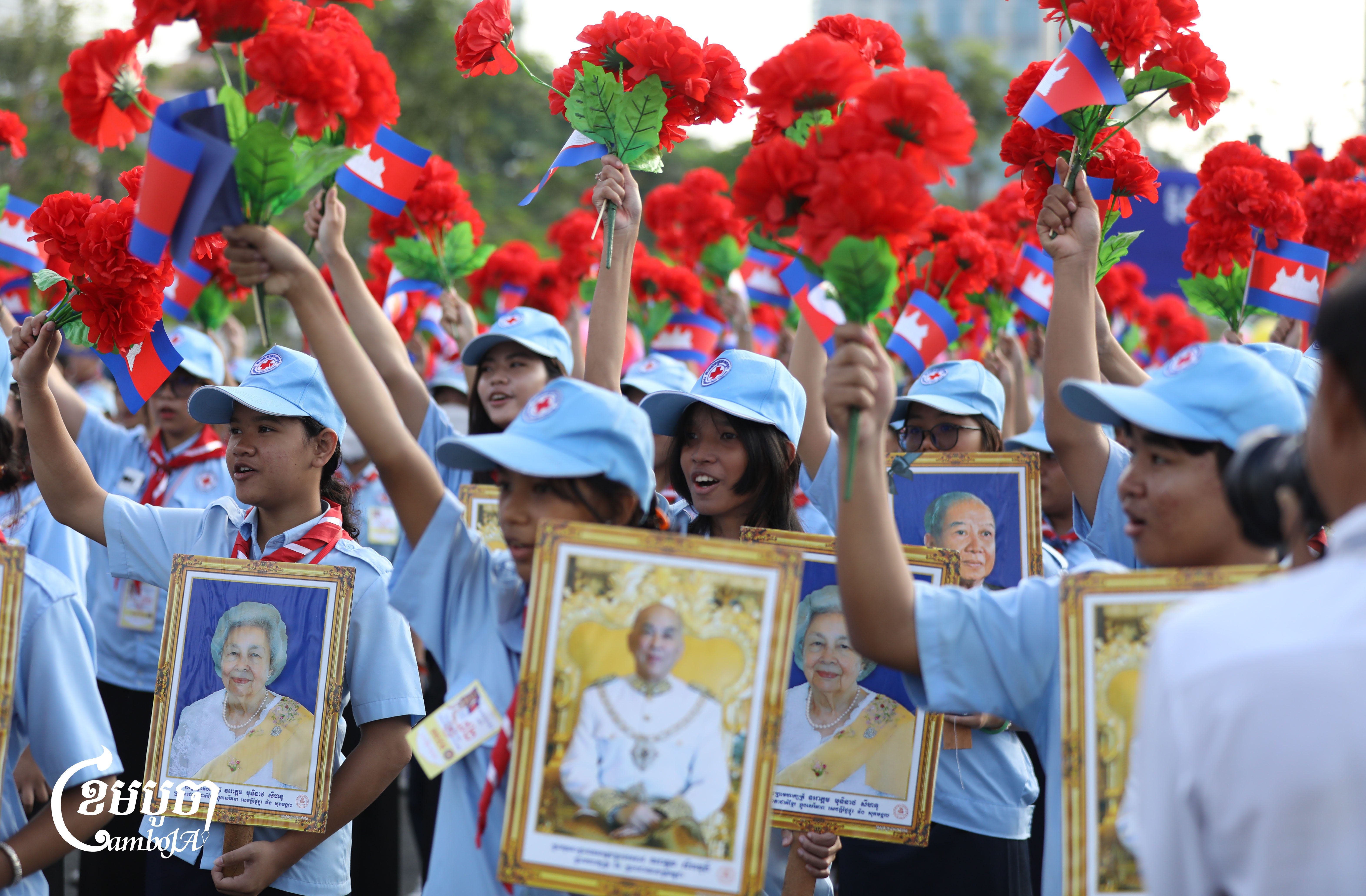 Officials and students participate in Independence Day celebrations in Phnom Penh on November 9. This year, Cambodia celebrates the 72nd anniversary of gaining independence from France in 1953. The historic day, which honors the freedom attained from French colonial rule, was marked with King Norodom Sihamoni lighting a fire at the Independence Monument where hundreds sang the national anthem and witnessed the release of colorful balloons. (CamboJA/ Pring Samrang)
