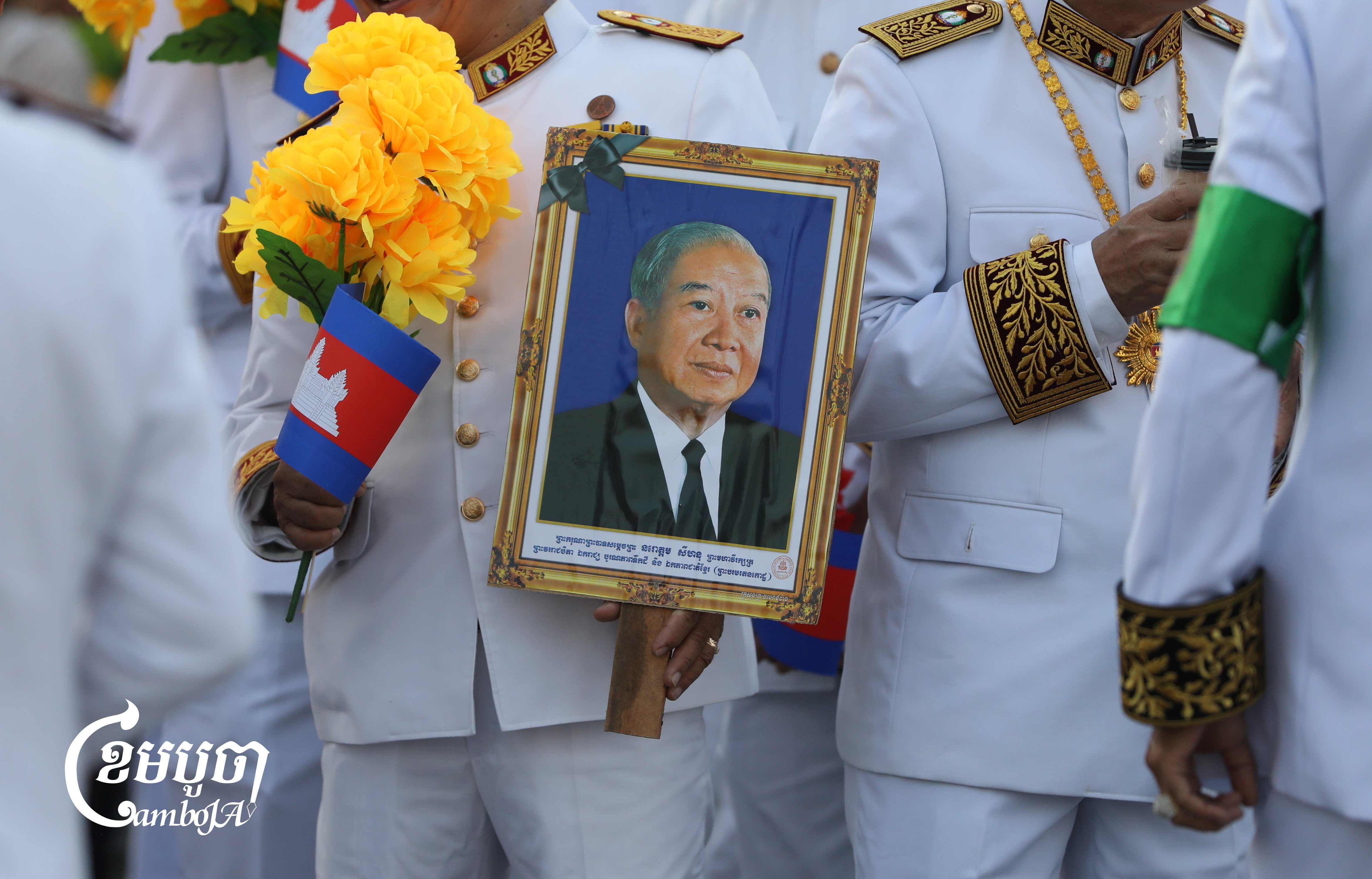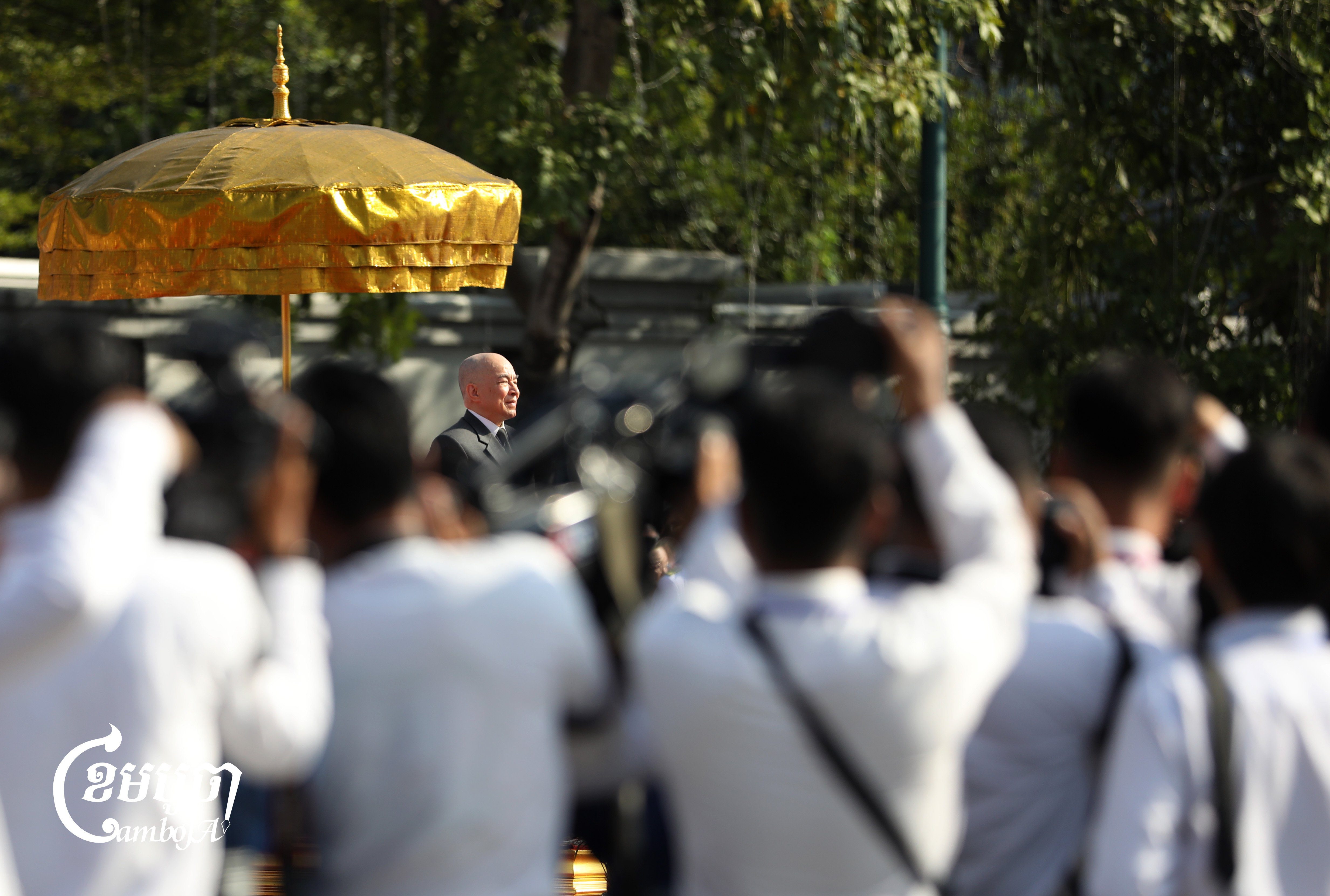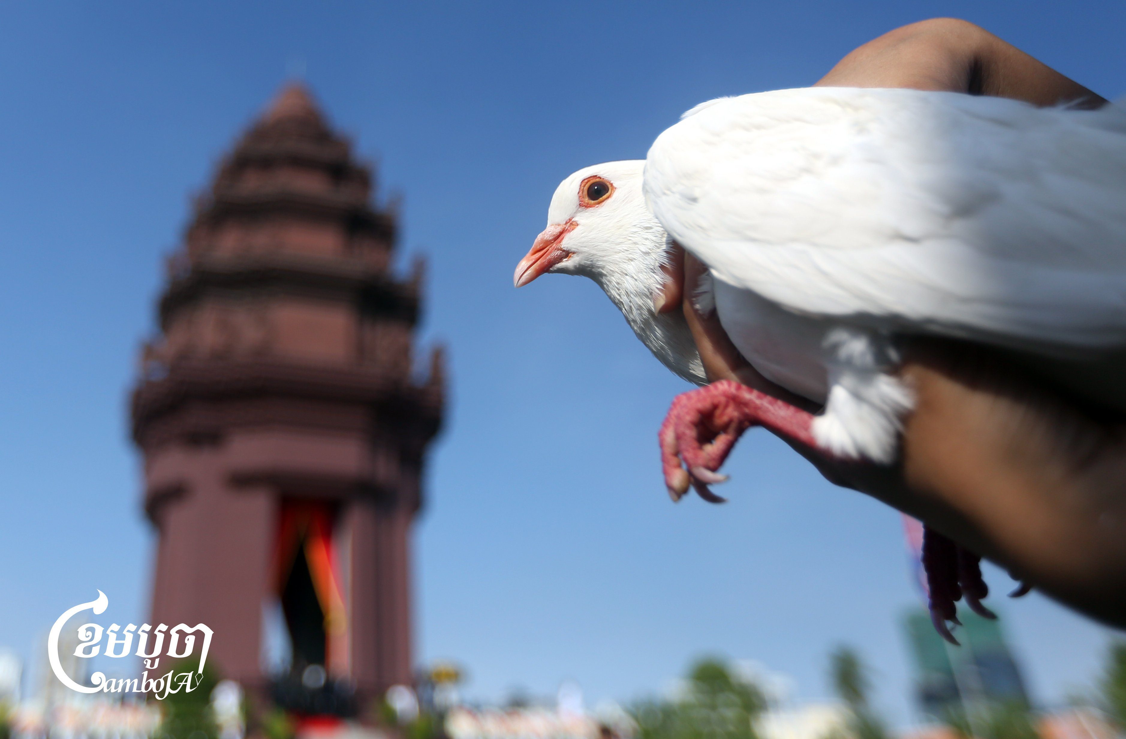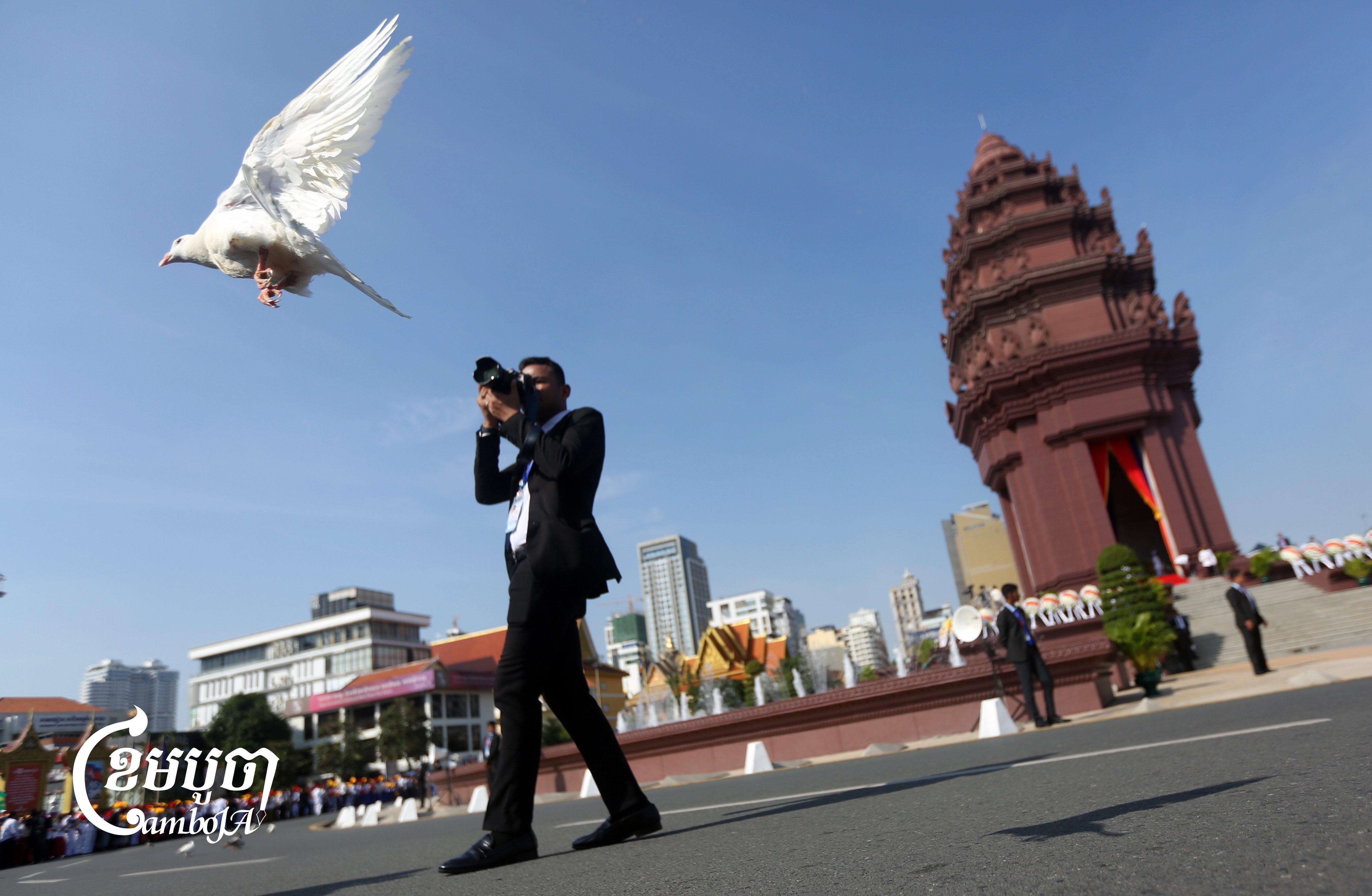Officials and students participate in Independence Day celebrations in Phnom Penh on November 9. This year, Cambodia celebrates the 72nd anniversary of gaining independence from France in 1953. The historic day, which honors the freedom attained from French colonial rule, was marked with King Norodom Sihamoni lighting a fire at the Independence Monument where hundreds sang the national anthem and witnessed the release of colorful balloons. (CamboJA/ Pring Samrang)