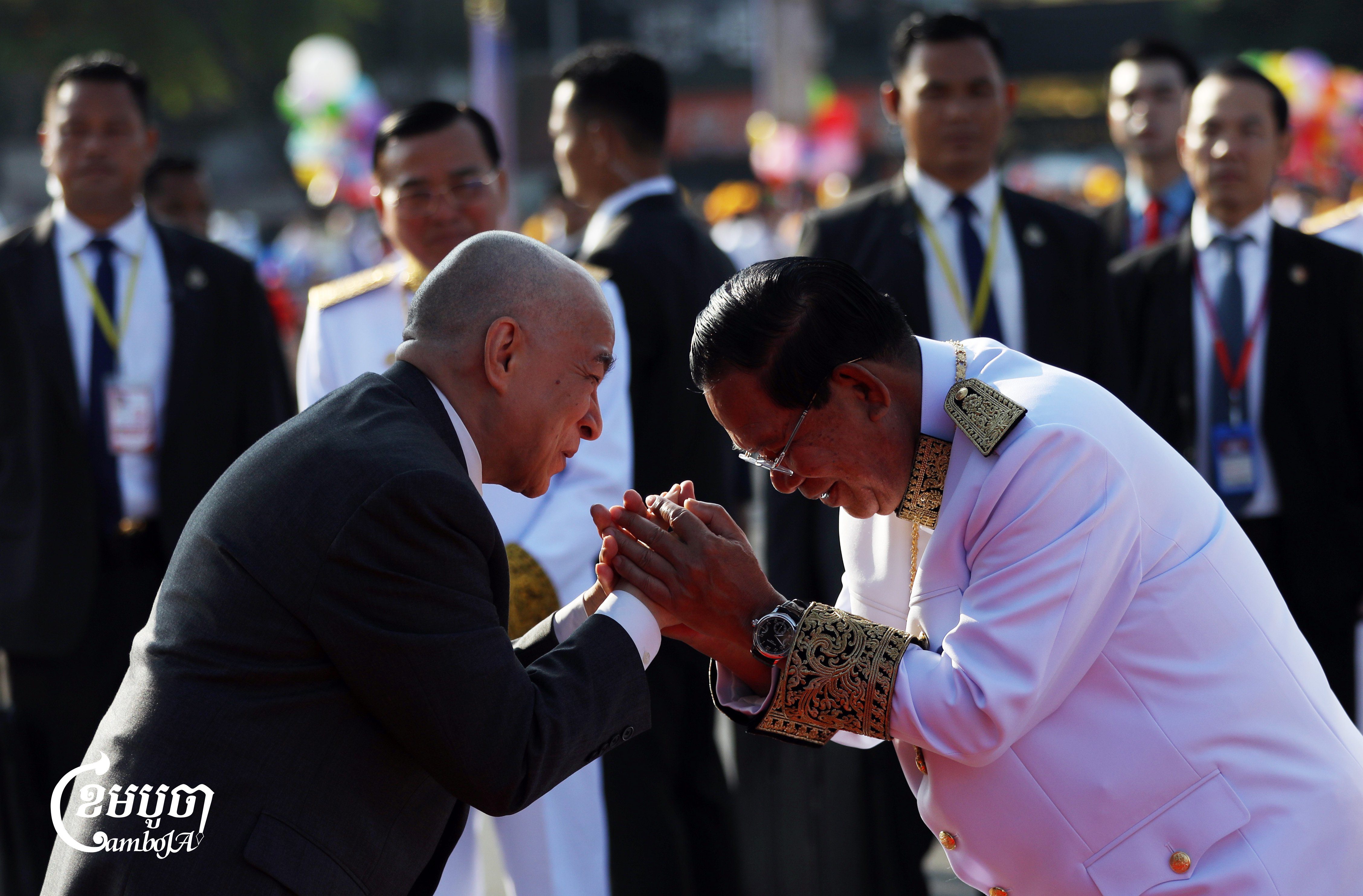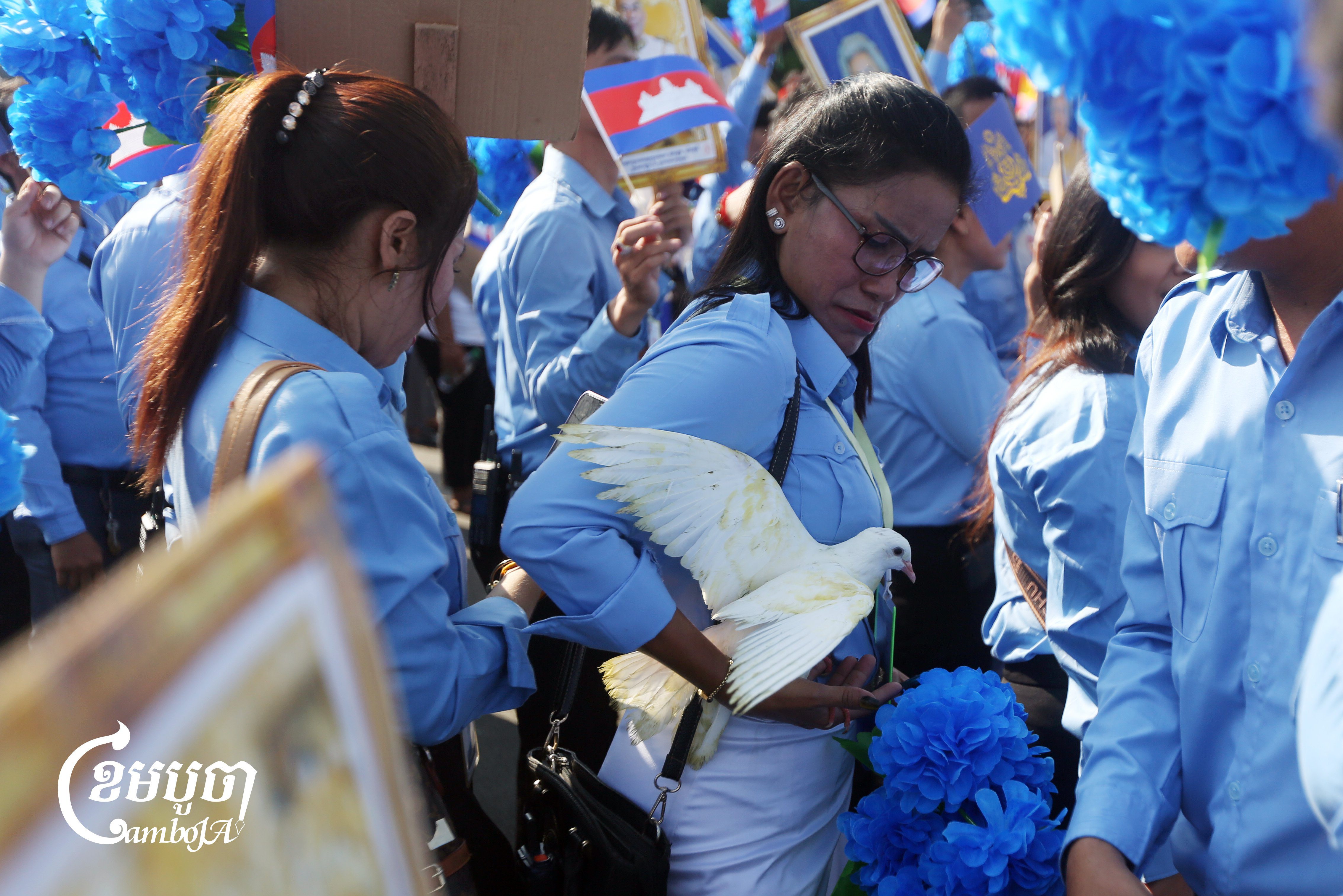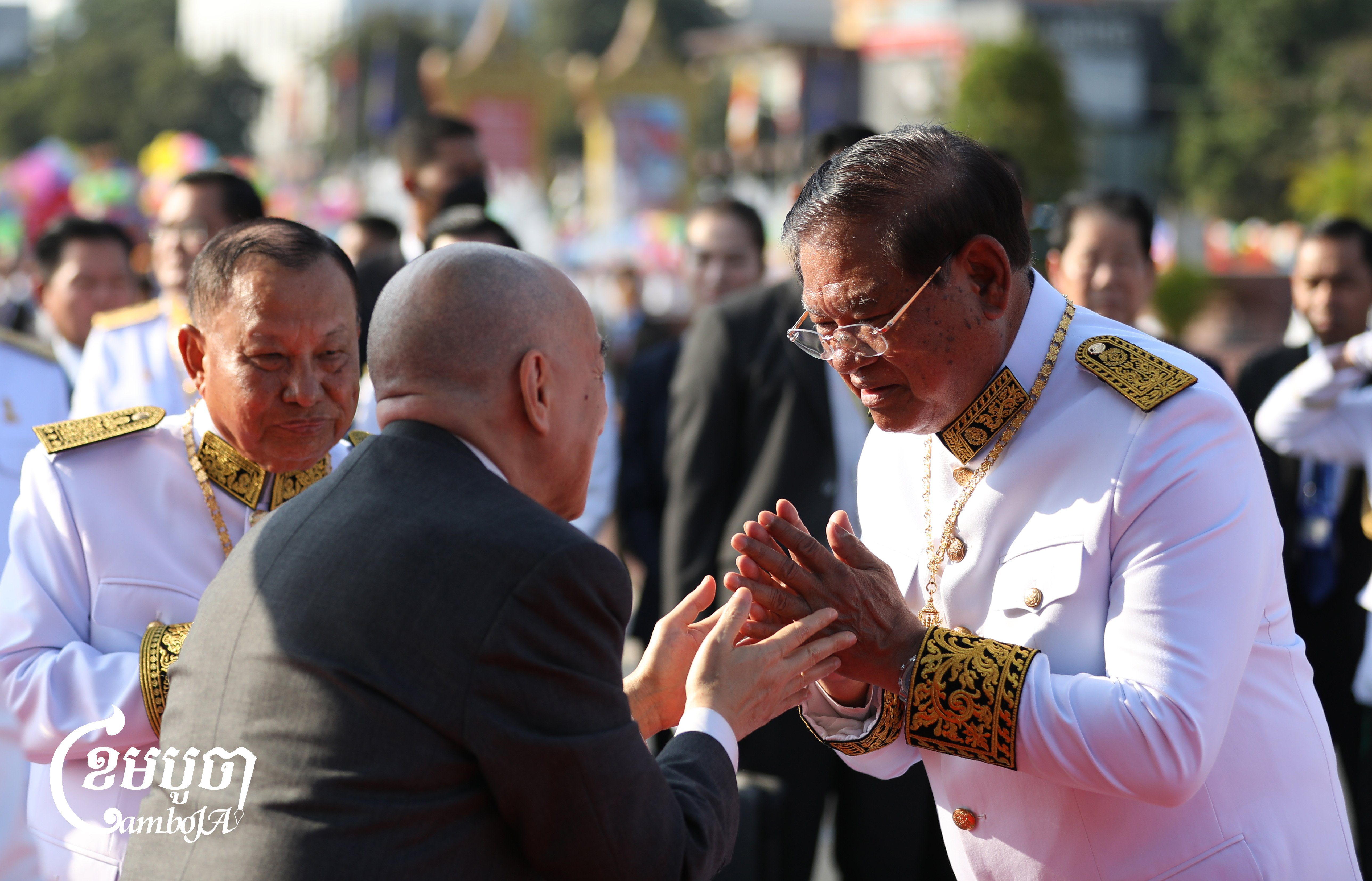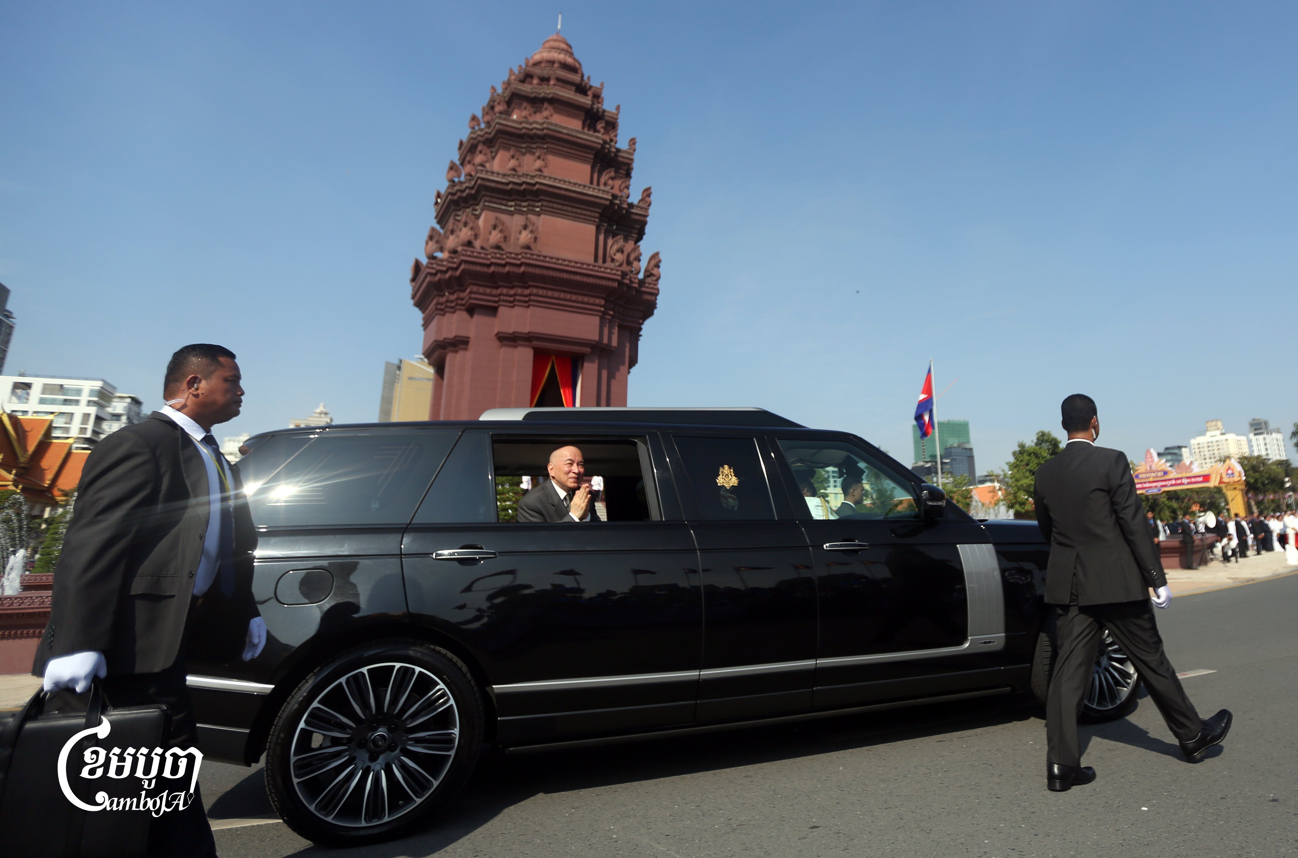Officials and students participate in Independence Day celebrations in Phnom Penh on November 9. This year, Cambodia celebrates the 72nd anniversary of gaining independence from France in 1953. The historic day, which honors the freedom attained from French colonial rule, was marked with King Norodom Sihamoni lighting a fire at the Independence Monument where hundreds sang the national anthem and witnessed the release of colorful balloons. (CamboJA/ Pring Samrang)
