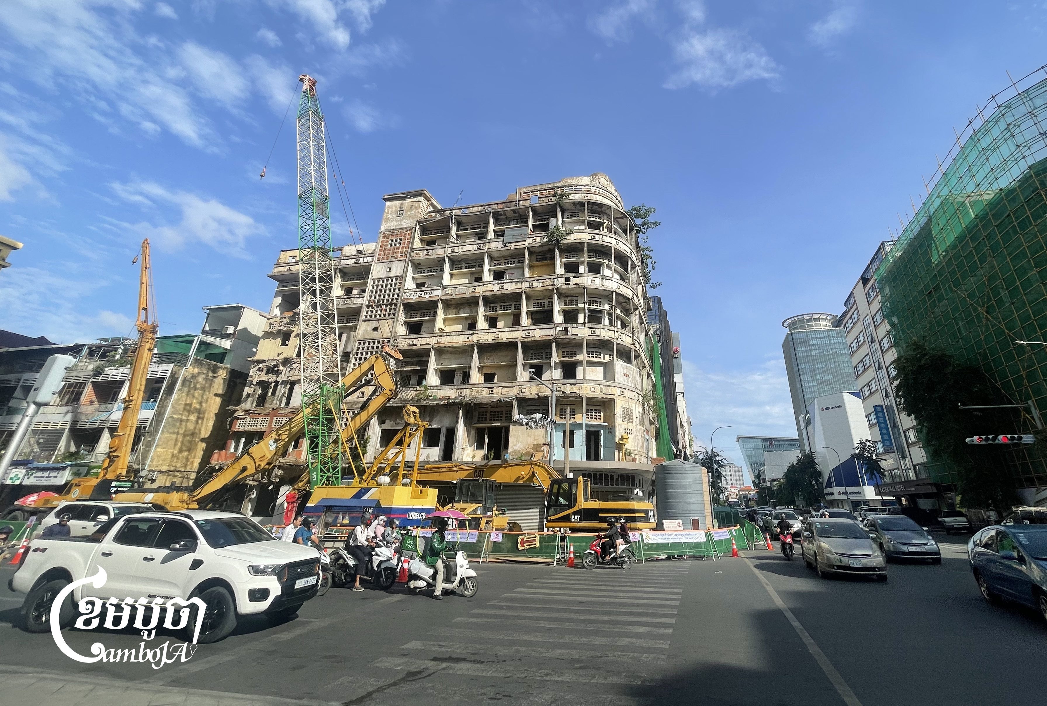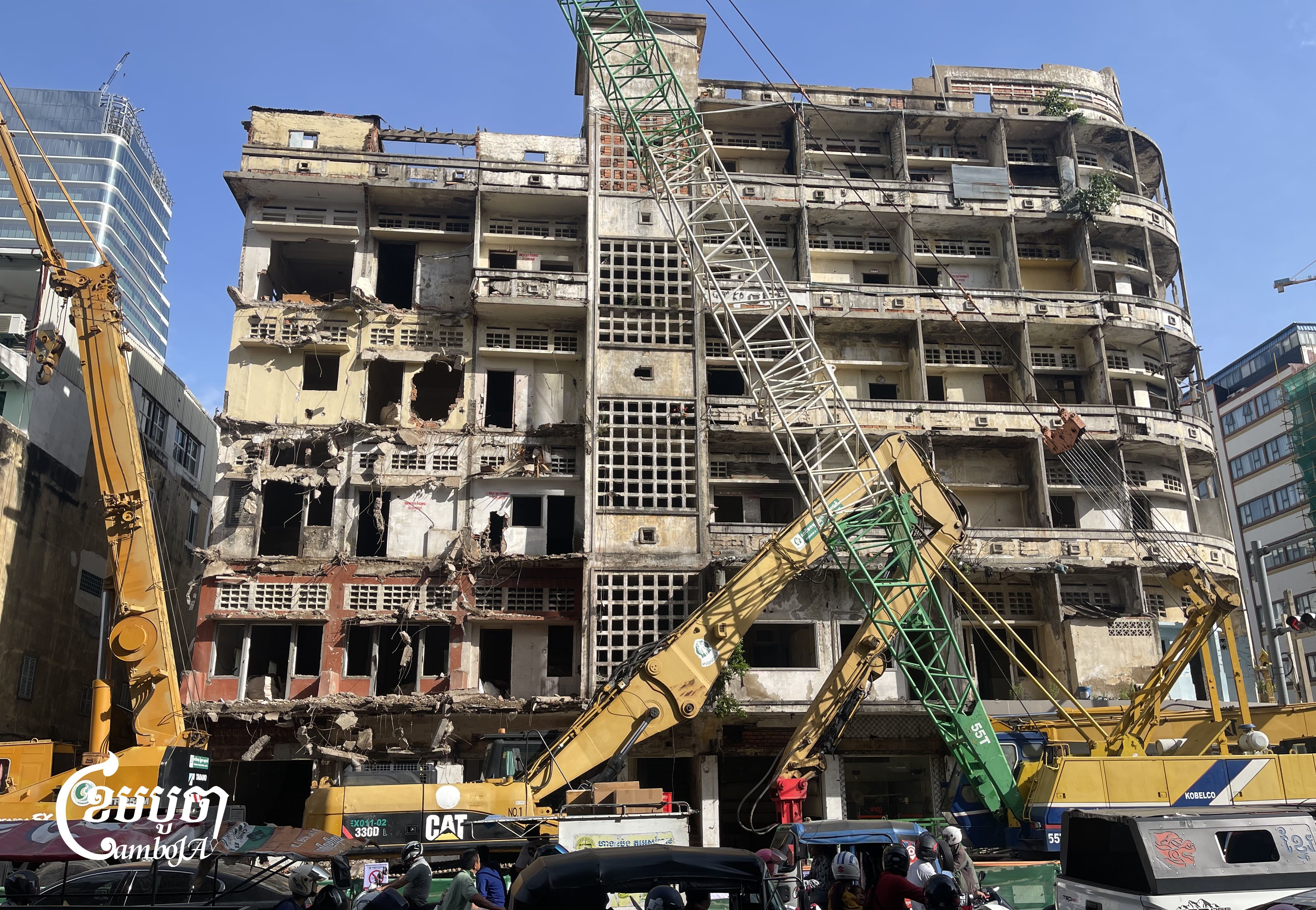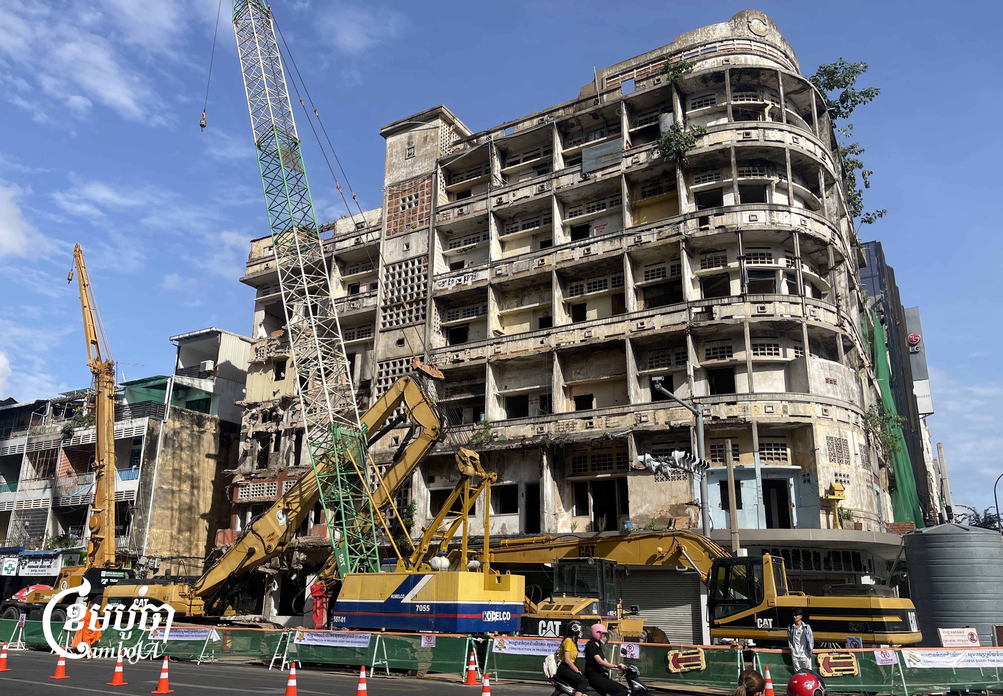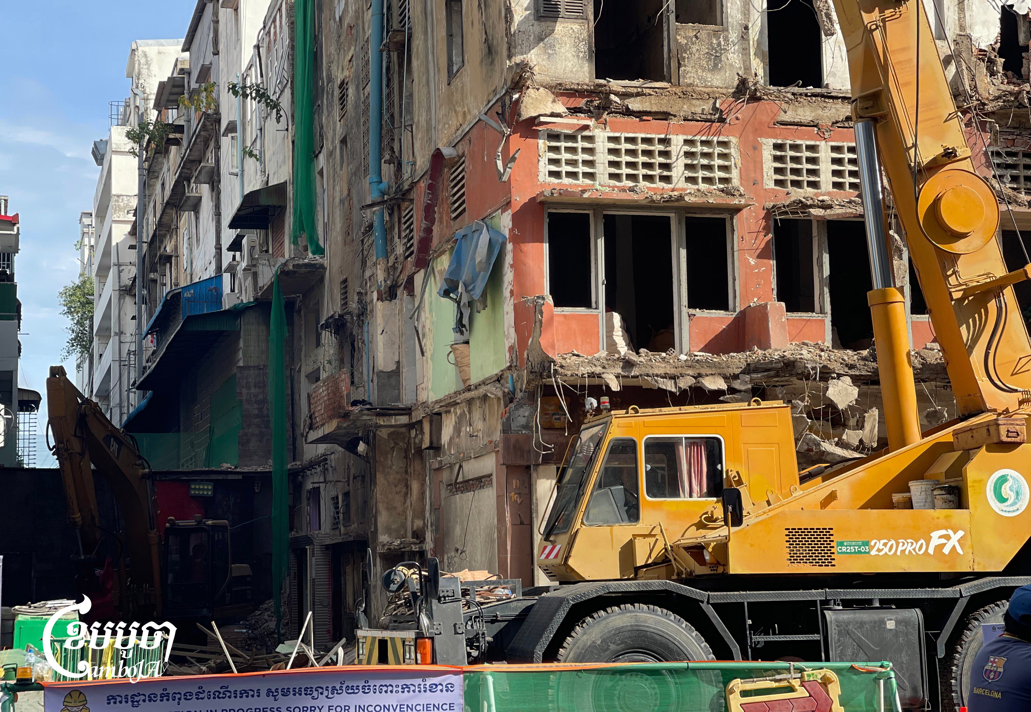 The 75-year-old Nokor Meanchey building on Kampuchea Krom Blvd is demolished. Constructed just before independence, it was once home to 65 families but now subjected to demolition over safety concerns on October 23, 2025.(CamboJA/Pring Samrang)
