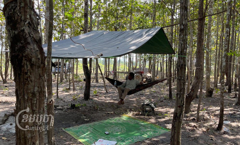 Along a red dirt road, villagers have set up a makeshift campsite with tents, hammocks, and enough food to keep them going. Among them is 31-year-old Lork Sokly, who told visiting CamboJA reporters that while the group had managed to get rid of a bulldozer in the area, soldiers were still sneaking in to cut down trees.