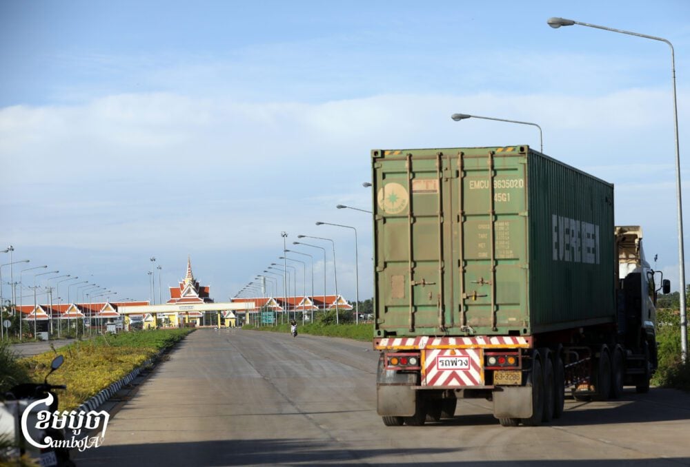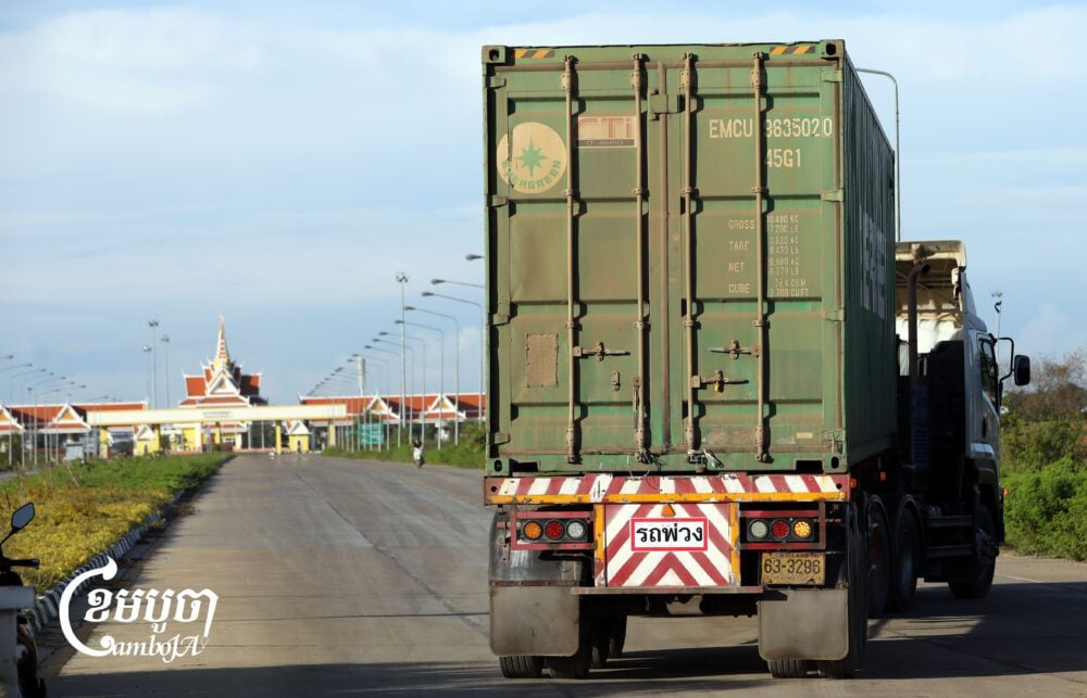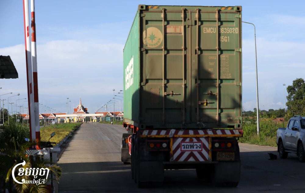 A Thai container truck waits to cross the Stung Bot border checkpoint at Banteay Meanchey province, June 9, 2025. (CamboJA/Pring Samrang)